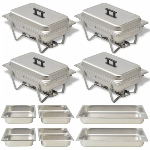 This set of 4 chafing dishes is very practical and ideal for keeping food warm or hot for prolonged periods. It is ideal for use in catering, restaurants, hotels, or parties or family get-togethers at home. Made of high-quality stainless steel, the chafing dish set has a solid construction and is easy to clean. The food pans have the standard "Gastronorm" dimensions, thus allowing universal use and a wide range of combinations. The water pans and food pans have rounded corners for easy cleaning. The lids have a heat-insulating handle and can be conveniently placed on the stand thanks to the 2 integrated hooks. With 2 handles on the stands, the food warmers are easy to move. The stands also have a shelf for holding the burners.