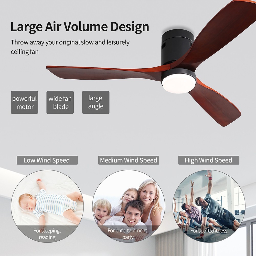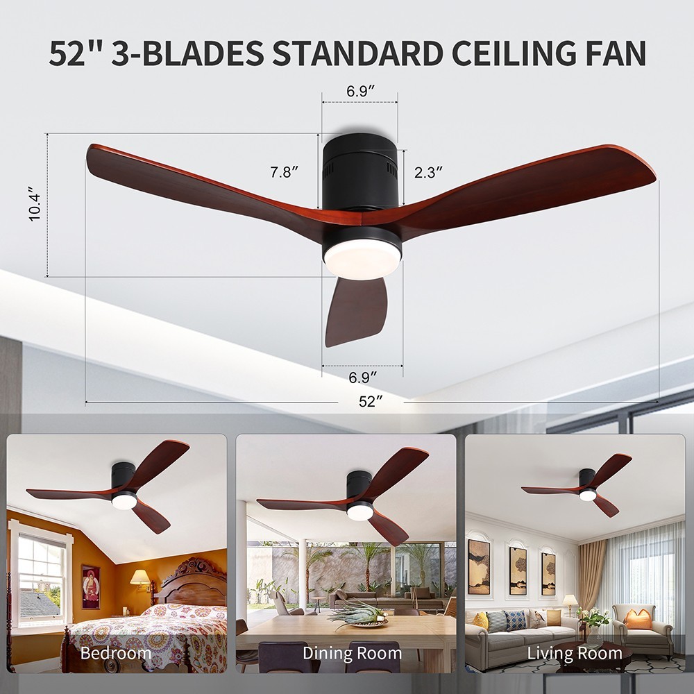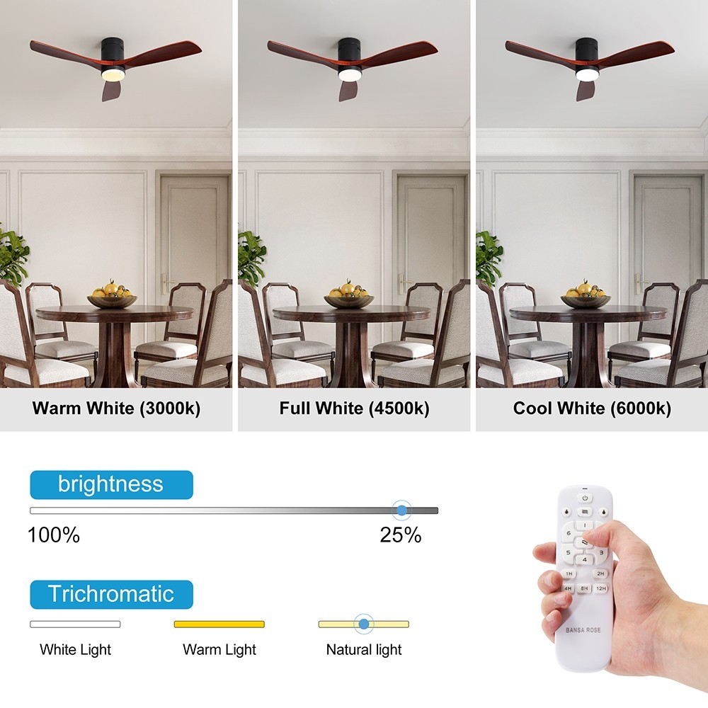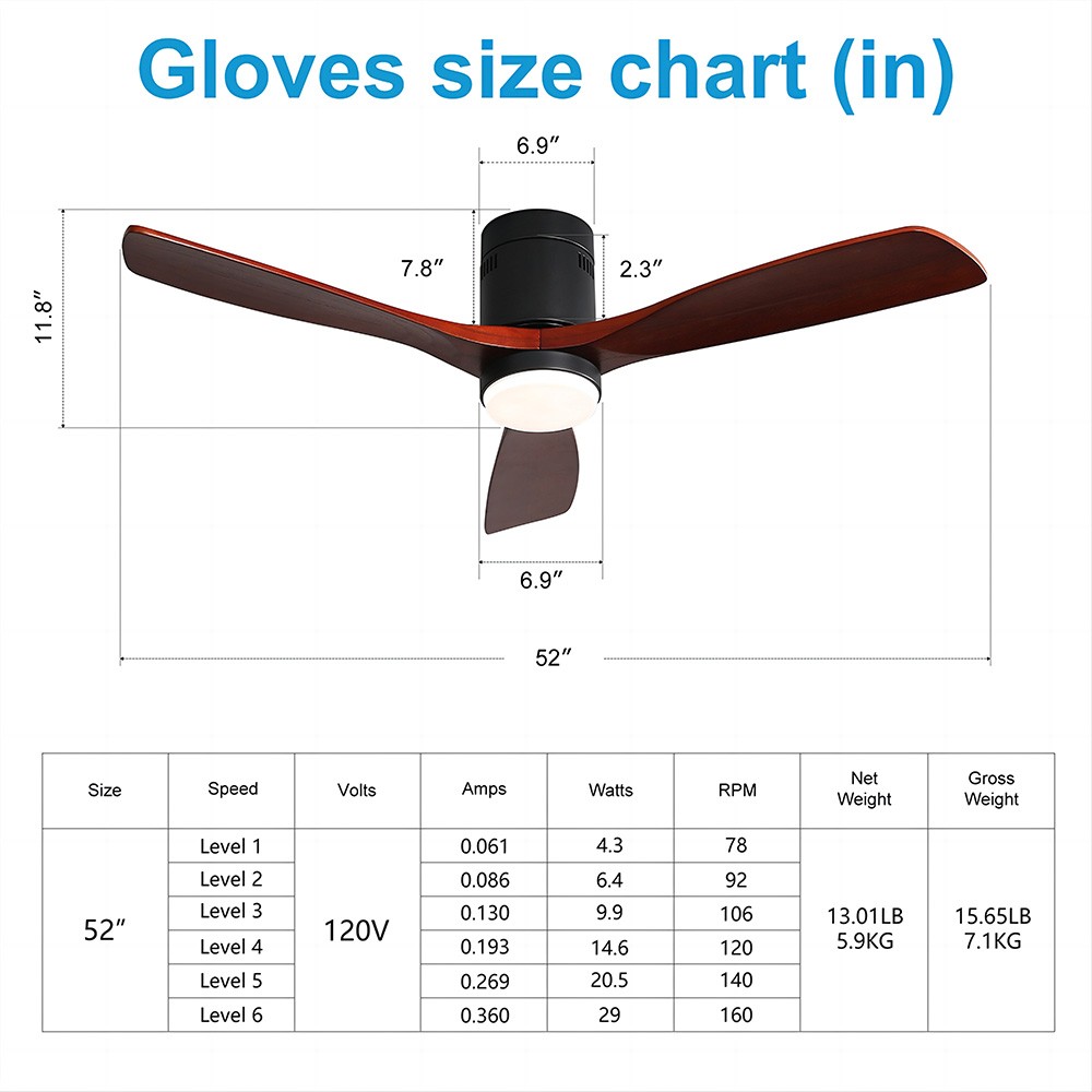 | Specification | Main Color: matte black (painted) Motor Size: DC153*12 Overall Diameter: 52 inches Hanging Rods: No Bulb: LED 15W (three-color dimmer with memory) Switch: remote control Number of Fan Blades: 3 Fan Blade Size: 640mm Fan Blade Material: solid wood Fan Blade Color: mahogany color Motor RPM: 180 Voltage/Frequency: 120V/60HZ Motor Power: 28W |