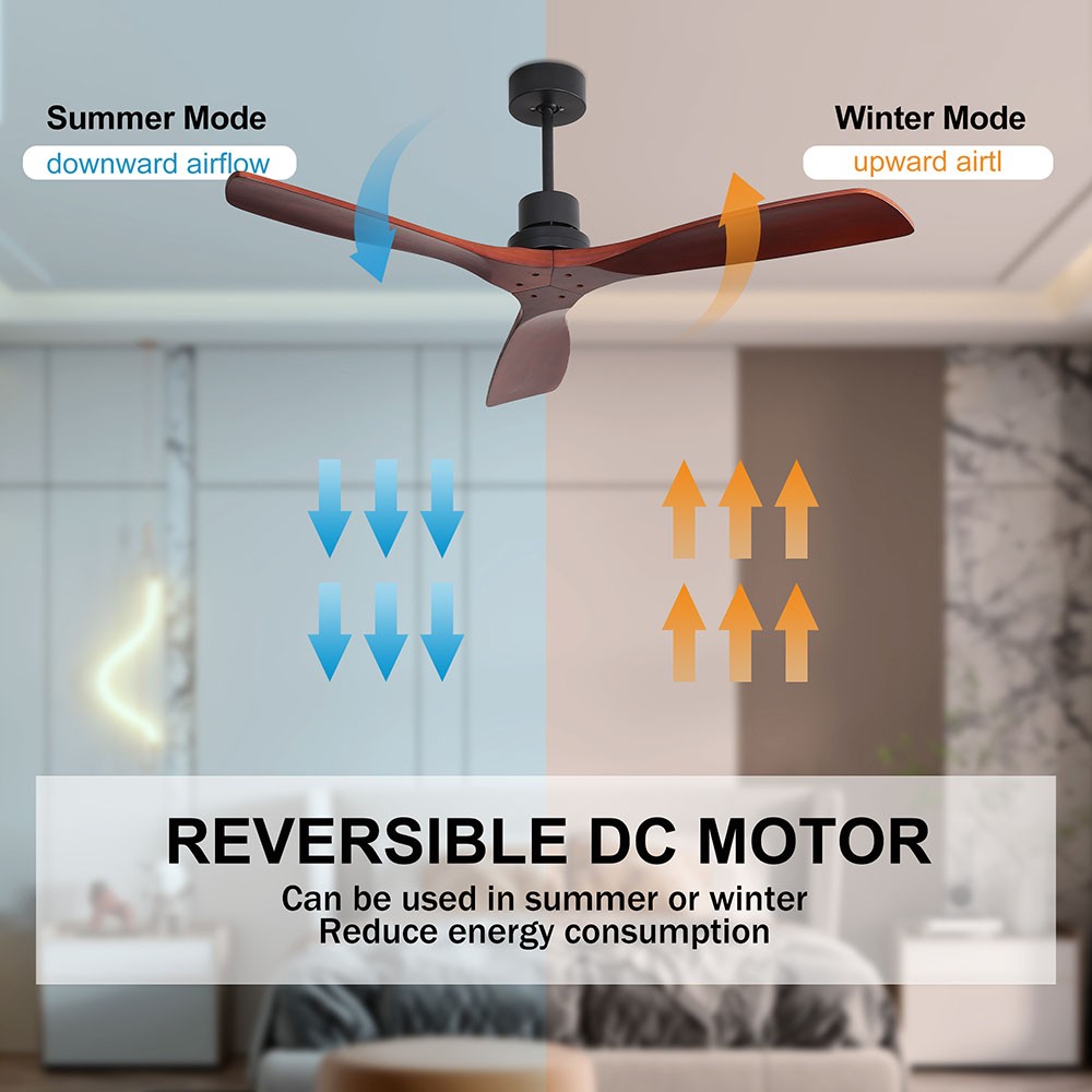 A reversible motor allows you to change the direction of your fan to be run in winter to rotate warm air and help distributes warm air evenly throughout the room while cooling down in the summer. Compared with the traditional AC motor, the DC motor can save energy by 50%, and the noise is lower than 35 decibels.