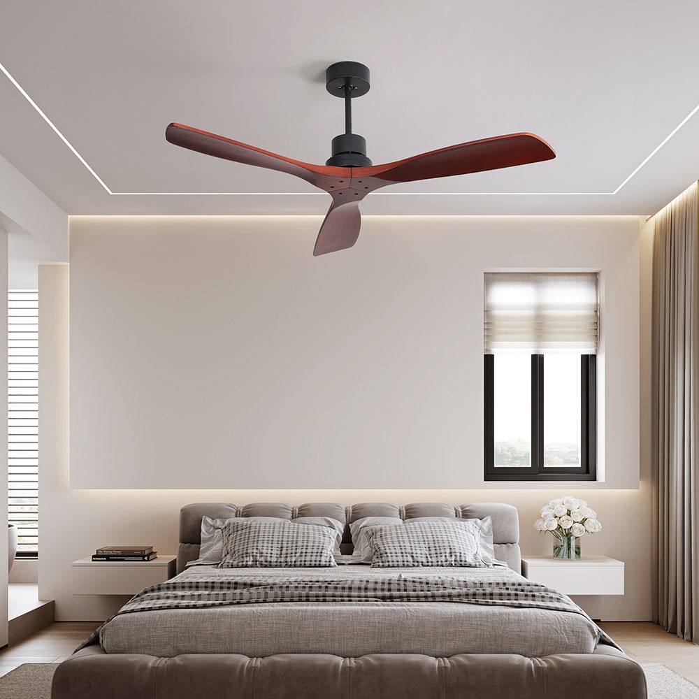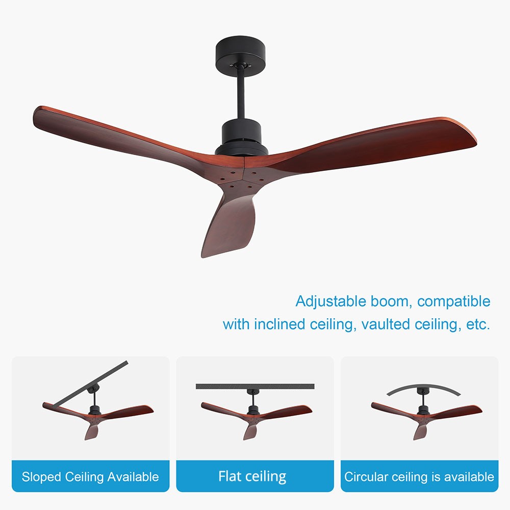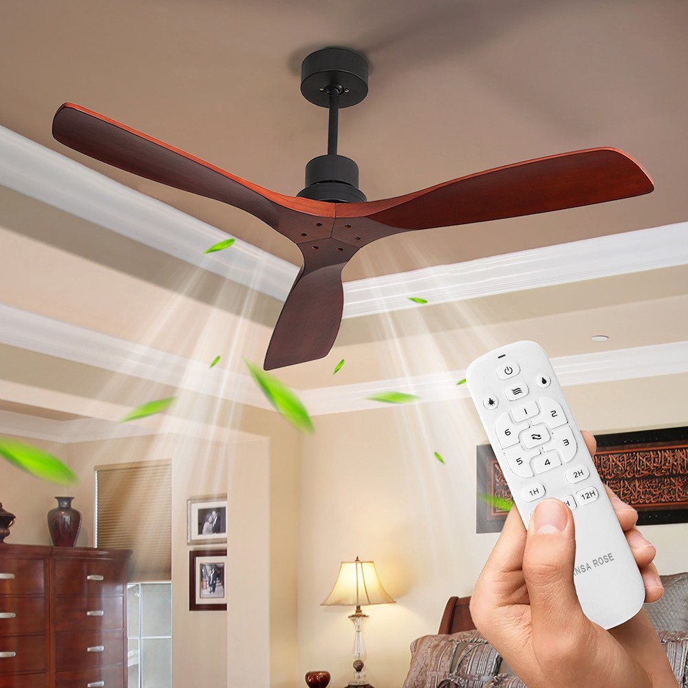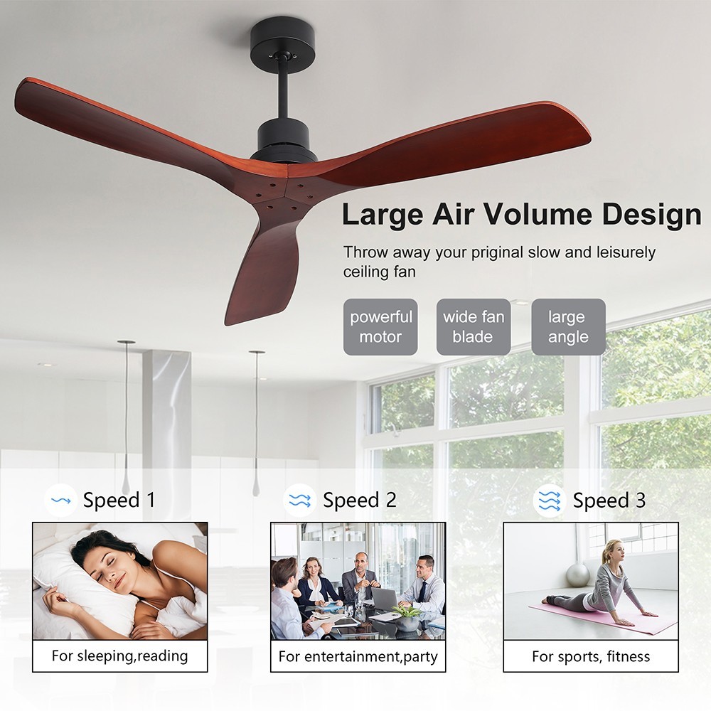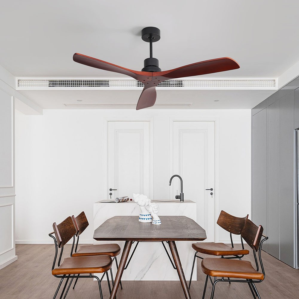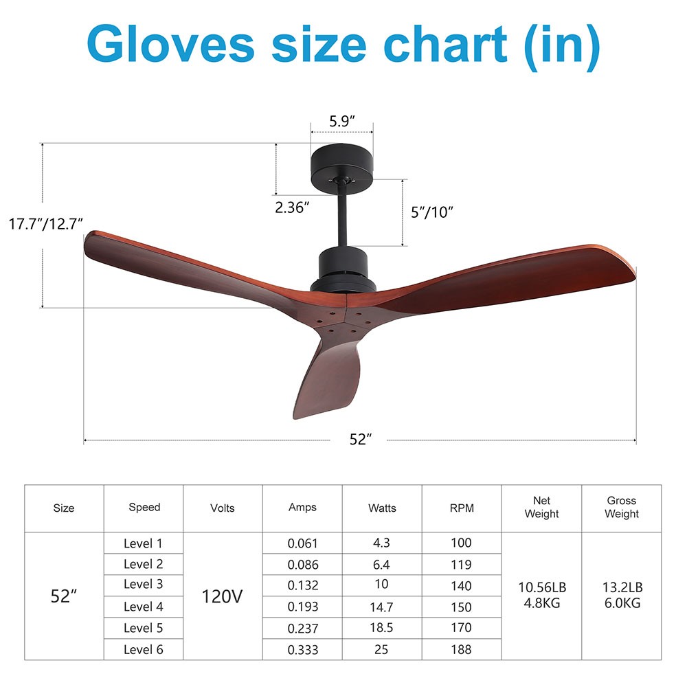 | Specification | Main Color: matte black (painted) Motor Size: DC153*12 Overall Diameter: 52 inches Hanging Rods Length: (diameter, 26.5MM) length: 125MM, 250MM Switch: remote control Number of Fan Blades: 3 Fan Blade Size: 660MM Fan Blade Material: solid wood Fan Blade Color: mahogany color Motor RPM: 180 Voltage/Frequency: 120V/60HZ Motor Power: 28W |