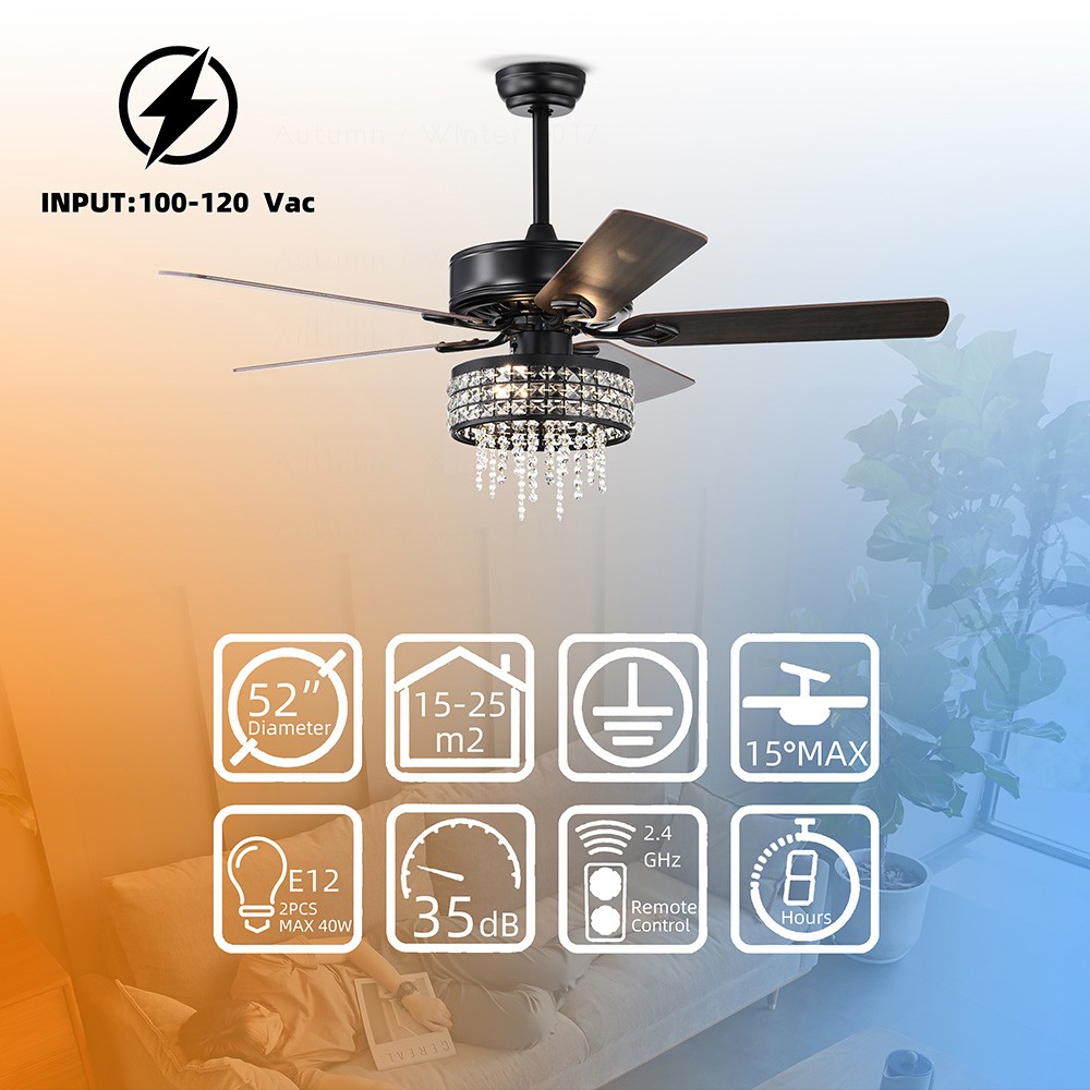 | Package Contents | 1 x Crystal Ceiling Fan 1 x Remote Control (Battery Not Included) 1 x User Manual |