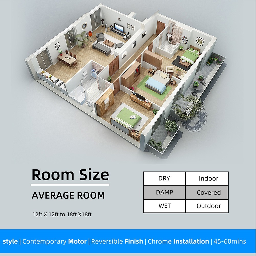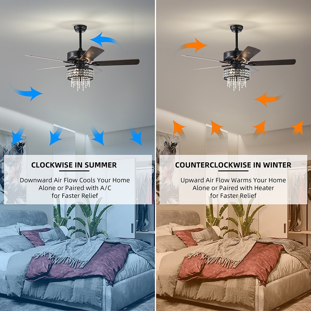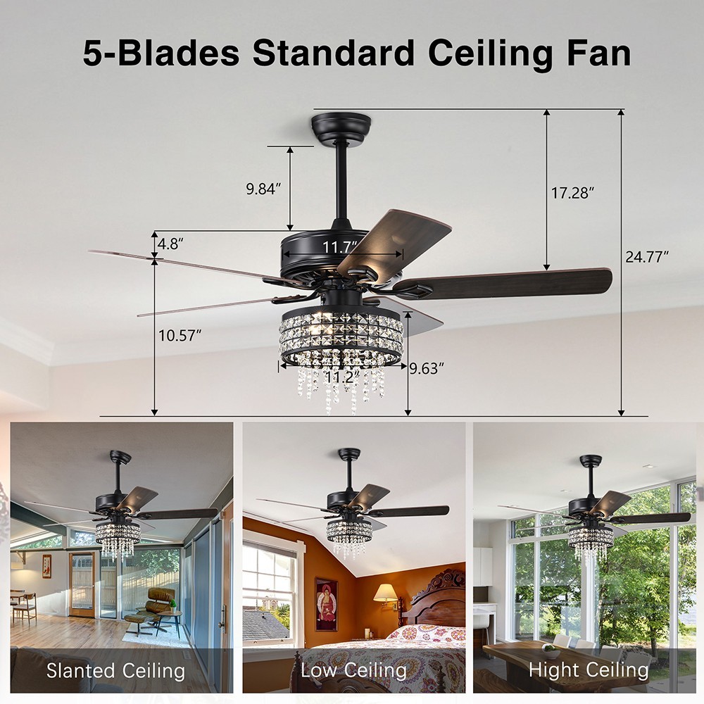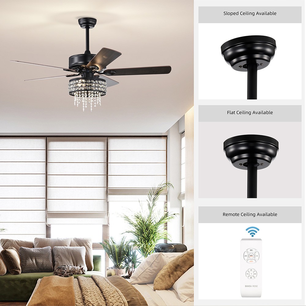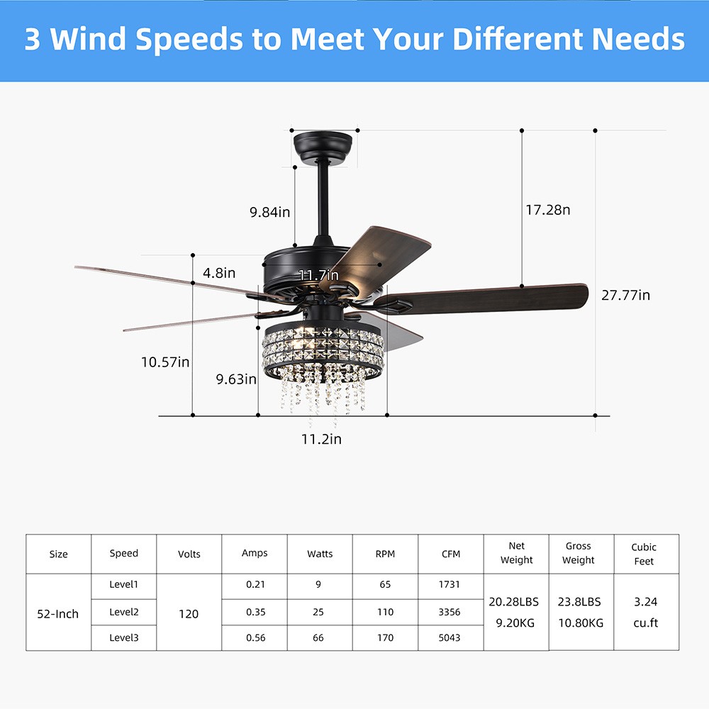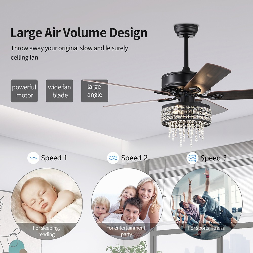 This fan features five blades that are operated by a 3-speed and reversible motor. Plus, the remote control is included. The elegant chandelier ceiling fan provides 3 wind speeds high, medium, and low to meet your daily need.