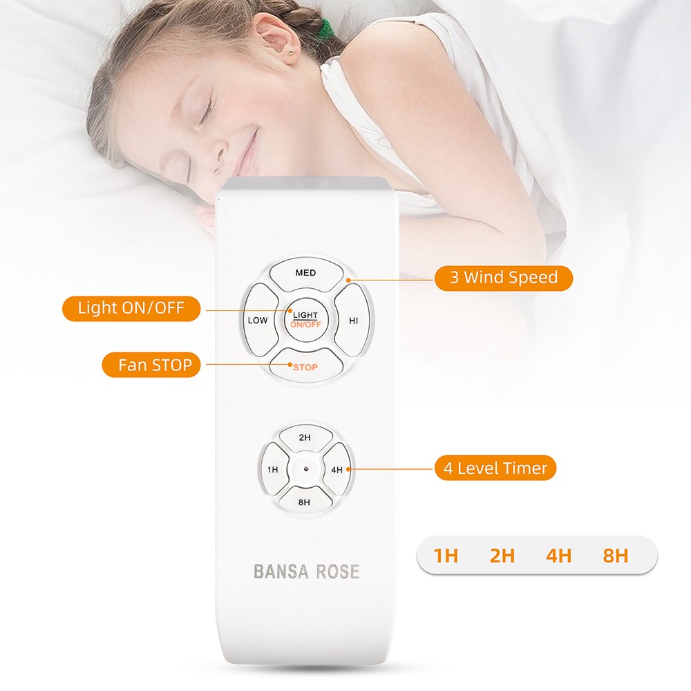 Quiet motor ceiling fan light with strong wind, the generator has no noise, so it can improve sleep quality. It also has a timer function with 1, 2, 4, and 8 hours. And there is a button beside the motor to control the positive and negative rotation, which can change the direction from downdraft mode during the summer to updraft mode during the winter.