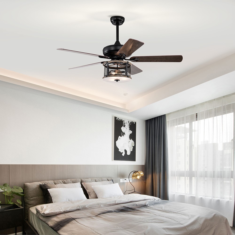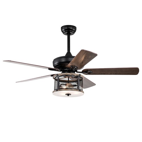 The ceiling fan offers a calming and casual feeling to your home with its metal mesh shade and frosted glass bottom. The light adds ambiance to your home office, living, or bedroom space.