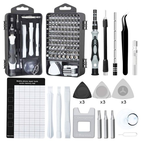 The 122 in 1 screwdriver set includes 98 screwdriver bits, 3TorxTR screwdriver bits, 1 magnetized driver handle, 1 magnetizer/demagnetizer, 1 flexible extension shaft, 1 hexagonal sleeve socket for cordless drills, 1 anti-static tweezer, 2 plastic pry crowbars,3 ultra-thin & 6 normal triangle pry tools, 1 micro screw magnetic pad, 1 SIM card pin and 1 suction cup.