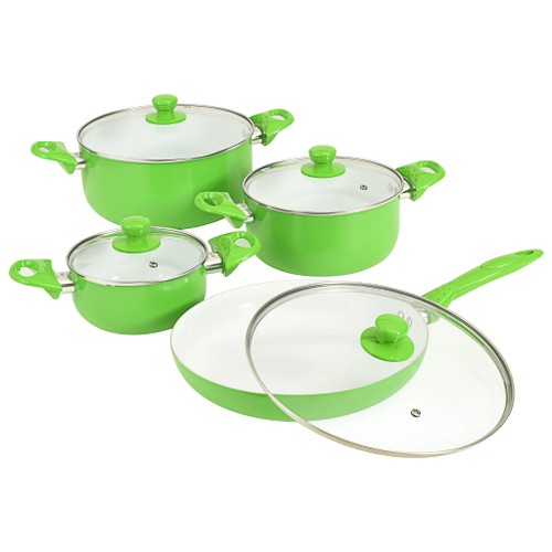 Fuel your day with our user-friendly cookware pan set! This 8-piece cookware set is suitable for many uses at home, as it is suitable for frying and cooking everything you can think of. The inner layer of each pan has been finished with 2 layers of ceramic coating, and the outer layer is coated with a green, high-temperature lacquer, making these pans durable, convenient, as well as safe to use. Featuring an even heat distribution and excellent heat conductivity, the set is ideal for cooking. Additionally, the handles are heat resistant which provides extra safety. The cooking set is also easy to clean. The set contains: one 16 x 8 cm sauce pot with glass lid, one 20 x 9.5 cm sauce pot with glass lid, one 24 x 10.5 cm sauce pot with glass lid and one 28 x 5.5 cm frypan with glass lid.