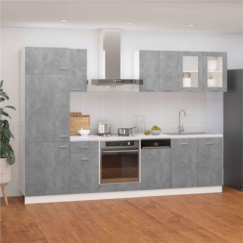 This 8-piece kitchen cabinet set, with its elegant design, optimises your kitchen space and provides ample storage space for your personal belongings! These cabinets are durable and functional, keeping your kitchen more organised. They also offer sufficient space to store bowls, plates, pots, and other kitchen appliances. The dishwasher panel features a simple design and can protect the dishwasher. Additionally, this set is easy to clean with a damp cloth. Please note: The worktop, faucet, sink and electric appliances are not included in the delivery.