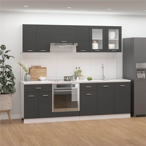 This 8-piece kitchen cabinet set, with its elegant design, optimises your kitchen space and provides ample storage space for your personal belongings! These cabinets are durable and functional, keeping your kitchen more organised. They also offer sufficient space to store bowls, plates, pots, and other kitchen appliances. Additionally, this set is easy to clean with a damp cloth. Please note: The worktop, faucet, sink and electric appliances are not included in the delivery.
