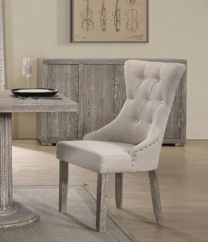 While the chairs are upholstered in two-tone beige fabric.