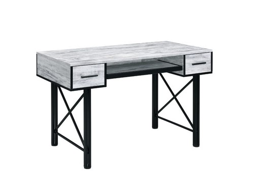 The Settee Desk brings a mix-and-match look with a distressed case good and black metal frame.