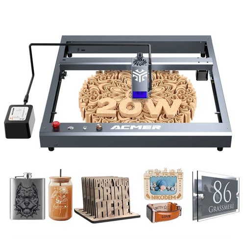 | Specification | Laser power: 20w Machine power: 130w Engraving accuracy: 0.01mm Compressed spot: 0.08*0.1mm Engraving speed: 30000mm/min Engraving size: 420*400mm Repeated positioning accuracy: 0.001mm Input voltage: AC 100-240V, 50/60Hz Support systems: Mac, Windows, Linux Connectivity: USB connection / ACMER App Output voltage: DC 24V 5A Support software: LaserGRBL, LightBurn (paid purchase) Input format: NC, BMP, JPG, PNG, DXF, etc. Laser protective cover: Filter glass eye protection Focusing mode: Fixed focusing laser; no need to adjust Carving Material: All wood, bamboo, paper, glass, plastic, leather, aluminum oxide, non-reflective plating, and lacquered metal Cutting Material: Cardboard, non-woven fabric, light wood, acrylic material, thin plastic sheet, stainless steel sheet Cutting Thickness: Cut 10mm plywood at one time, can cut 30mm acrylic board many times, cut 0.1mm stainless steel board |