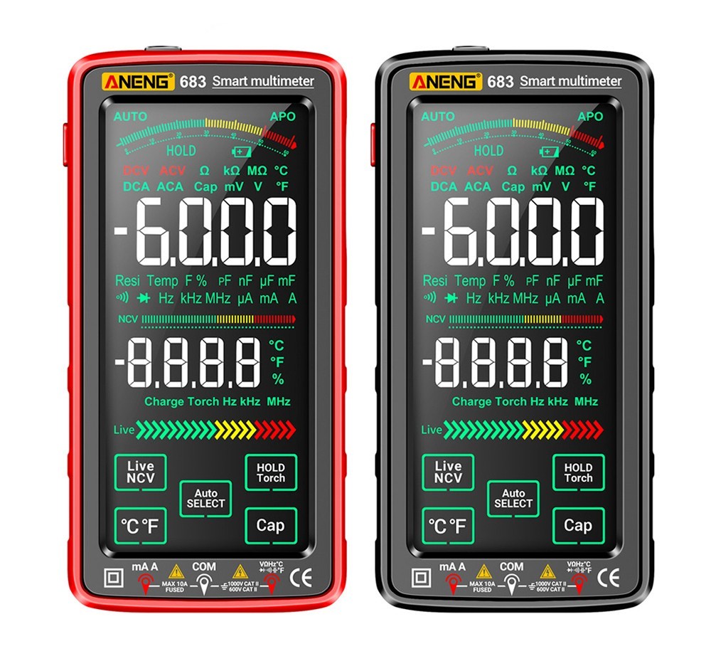 ANENG 683 is a digital multimeter with stable performance and reliable quality. The meter adopts an LCD display screen which has a smart sensor touch design and VA color reverse display. The input AC/DC voltage/resistance will be automatically identified and measured.