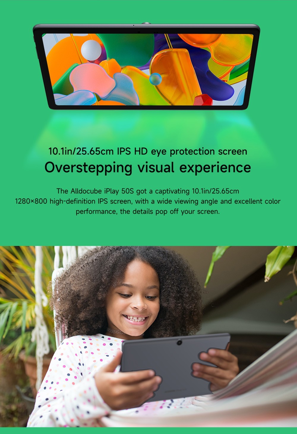 The Alldocube iPlay 50S got a captivating 10.1in/25.65cm 1280×800 high-definition IPS screen, with a wide viewing angle and excellent color performance, the details pop off your screen.
