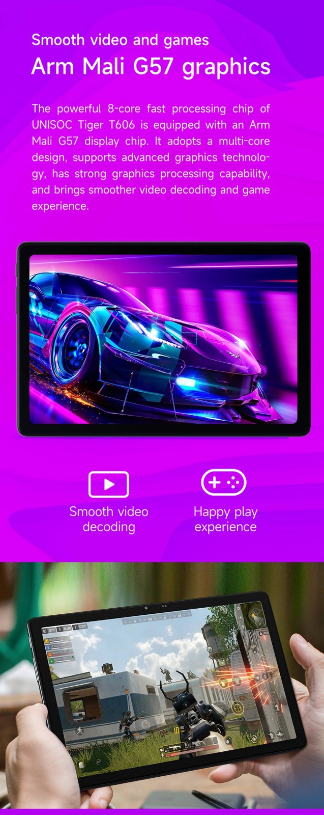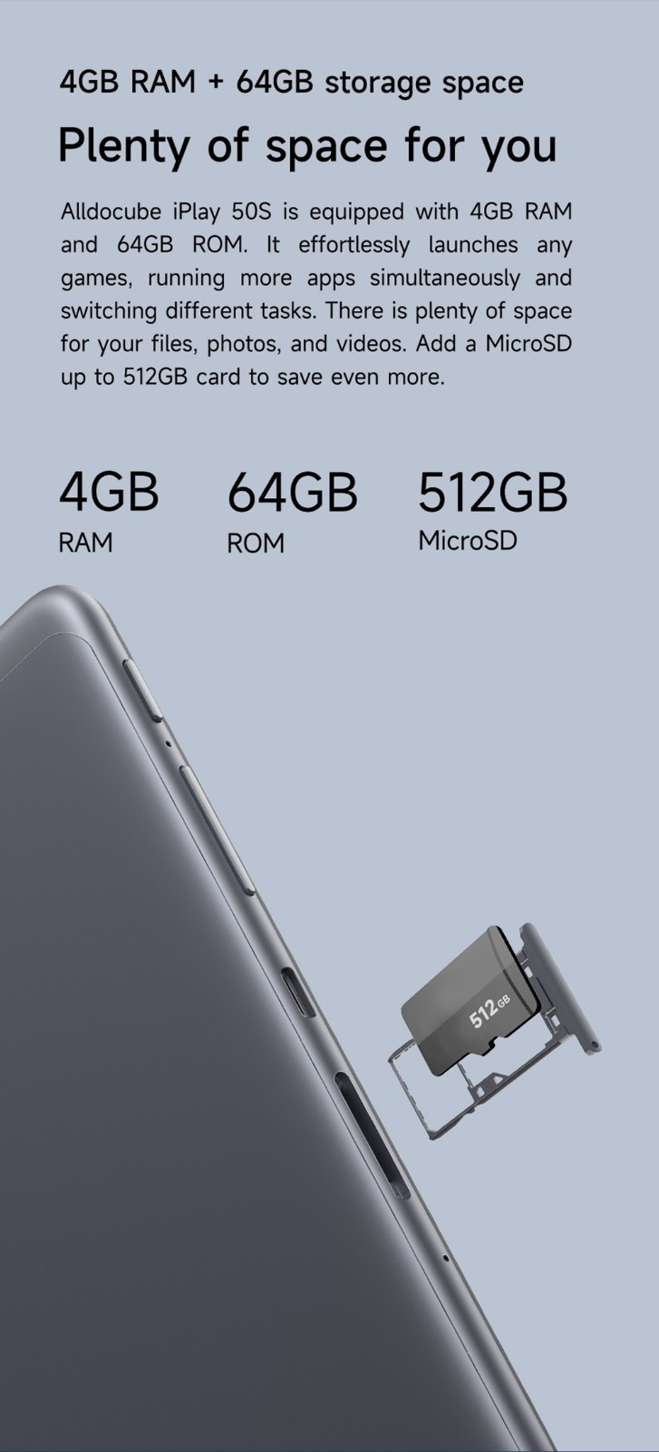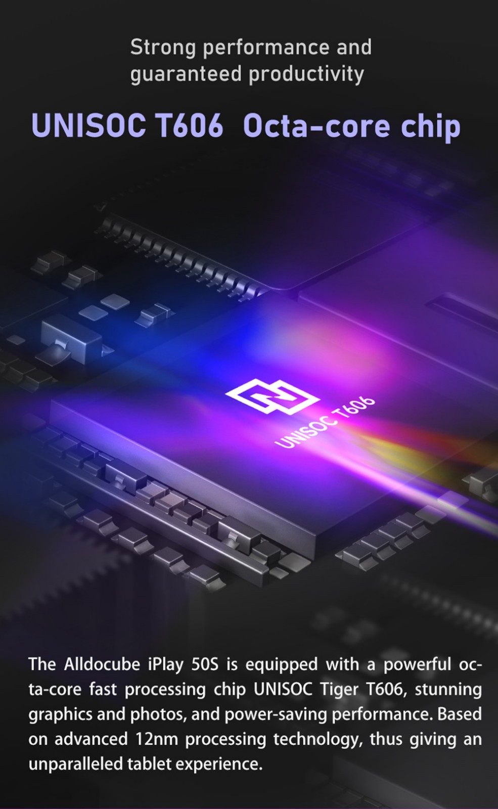 The Alldocube iPlay 50S is equipped with a powerful octa-core fast processing chip UNISOC Tiger T606, stunning graphics and photos, and power-saving performance. Based on advanced 12nm processing technology, thus giving an unparalleled tablet experience.