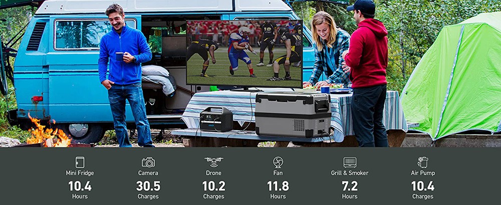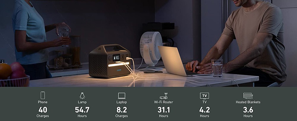 With a 512Wh capacity, the power station is an all-around solution to charge all your necessities, and seamlessly power a heater, portable fridge, lamp, and TV.