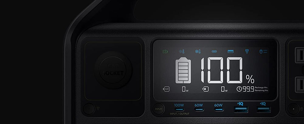 The smart display shows battery capacity, current output and input, and estimated time to recharge.
