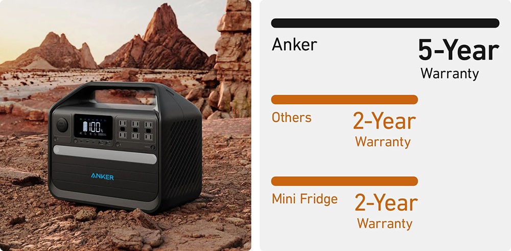 With proprietary long-lasting technology InfiniPower™, combined with LiFePO4 batteries, ultra-durable electronic components, a smart temperature control system that monitors temperature up to 100 times per second, and an impact-resistant structural design, Anker 555 PowerHouse is built to last over a decade, even with everyday use.