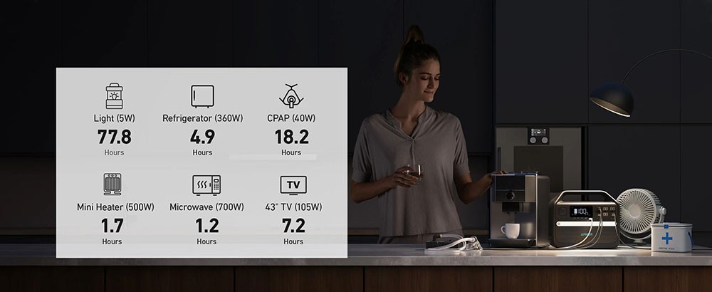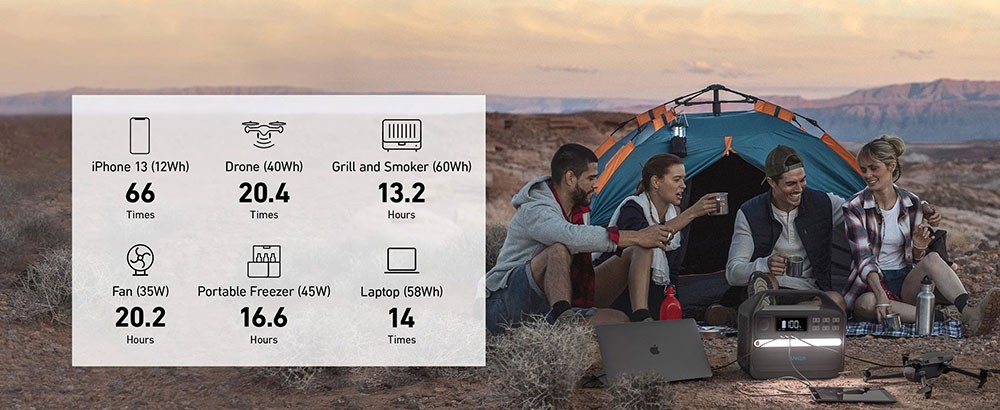 With a 1024Wh capacity and 1000W AC output, Anker PowerHouse 555 is an ideal solution to power all your essential devices and appliances during a trip, such as a smartphone, coffee maker, refrigerator, and more.