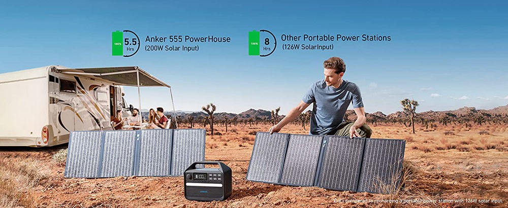 Fully recharge 555 PowerHouse in 5.5 hours with 200W solar input compared to those with 126W input.