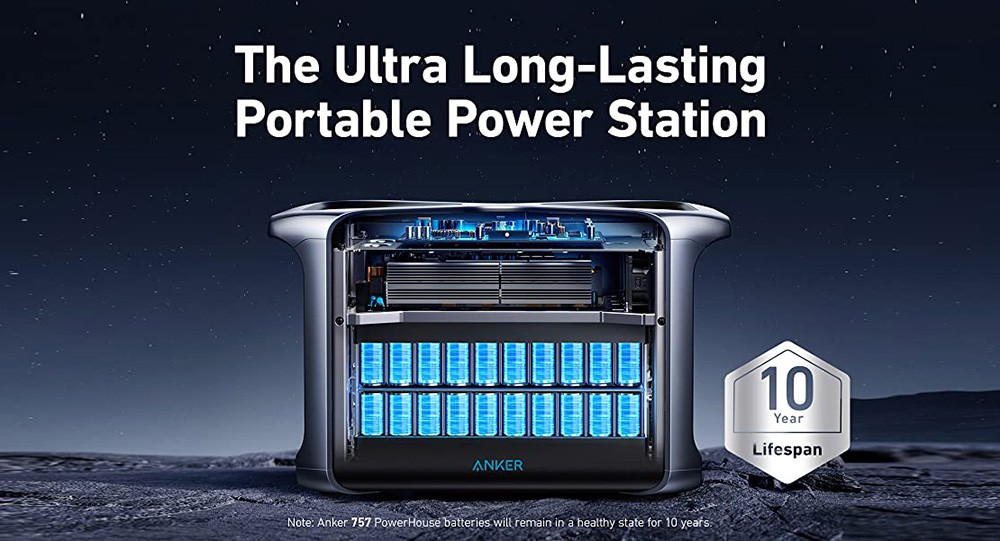 With proprietary long-lasting technology InfiniPower™, combined with LiFePO4 batteries, ultra-durable electronic components, a smart temperature control system that monitors temperature up to 100 times per second, and an impact-resistant structural design, Anker PowerHouse 757 is built to last over a decade, even with everyday use.