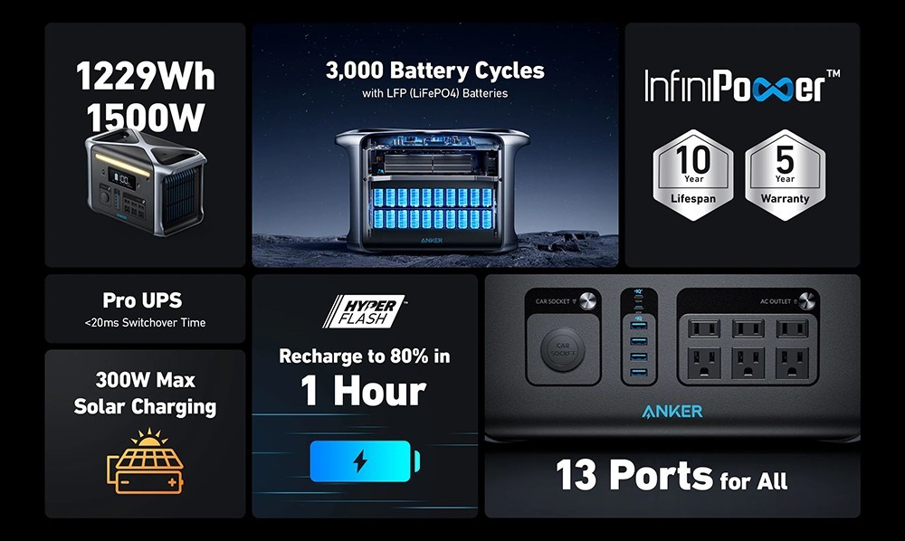 | Specification | Capacity: 1229Wh AC Input Voltage 100-120V, 12A Max, 50Hz/60Hz AC Input Power (Charging): 1000W Max AC Input Power (Bypass Mode): 1440W Max Solar Panel Input: 11-30V 10A (300W Max) AC Output: 110V, 13.64A, 50Hz/60Hz, 1500W Max AC Power Surge: 2400W USB-A Output: 4 x 12W, 5V 2.4A (2.4A Max Per Port) USB-C Output (100W): 5V 3A/9V 3A / 15V 3A/20V 3A/20V 5A (100W Max) USB-C Output (60W): 5V 3A/9V 3A/15V 3A/20V 3A (60W Max) Car Socket Output: 12V 10A Max UPS: <20ms Discharging Temperature: -4 - 104 Fahrenheit / -20 - 40 Celsius Charging Temperature: 32 - 104 Fahrenheit / 0 - 40 Celsius AC Recharge Time: 1 Hour to 80%, 1.5 Hours to 100% Solar Recharge Time: 3.6+ Hours to 80% |