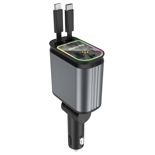 Car Charger with Starry Sky. The 4 in 1 car charger is equipped with a real PD 66W Type-C retractable cable (fast charging port), an IOS retractable cable, and additional USB-C and USB-A ports, this charger offers fast charging for up to four devices simultaneously.
