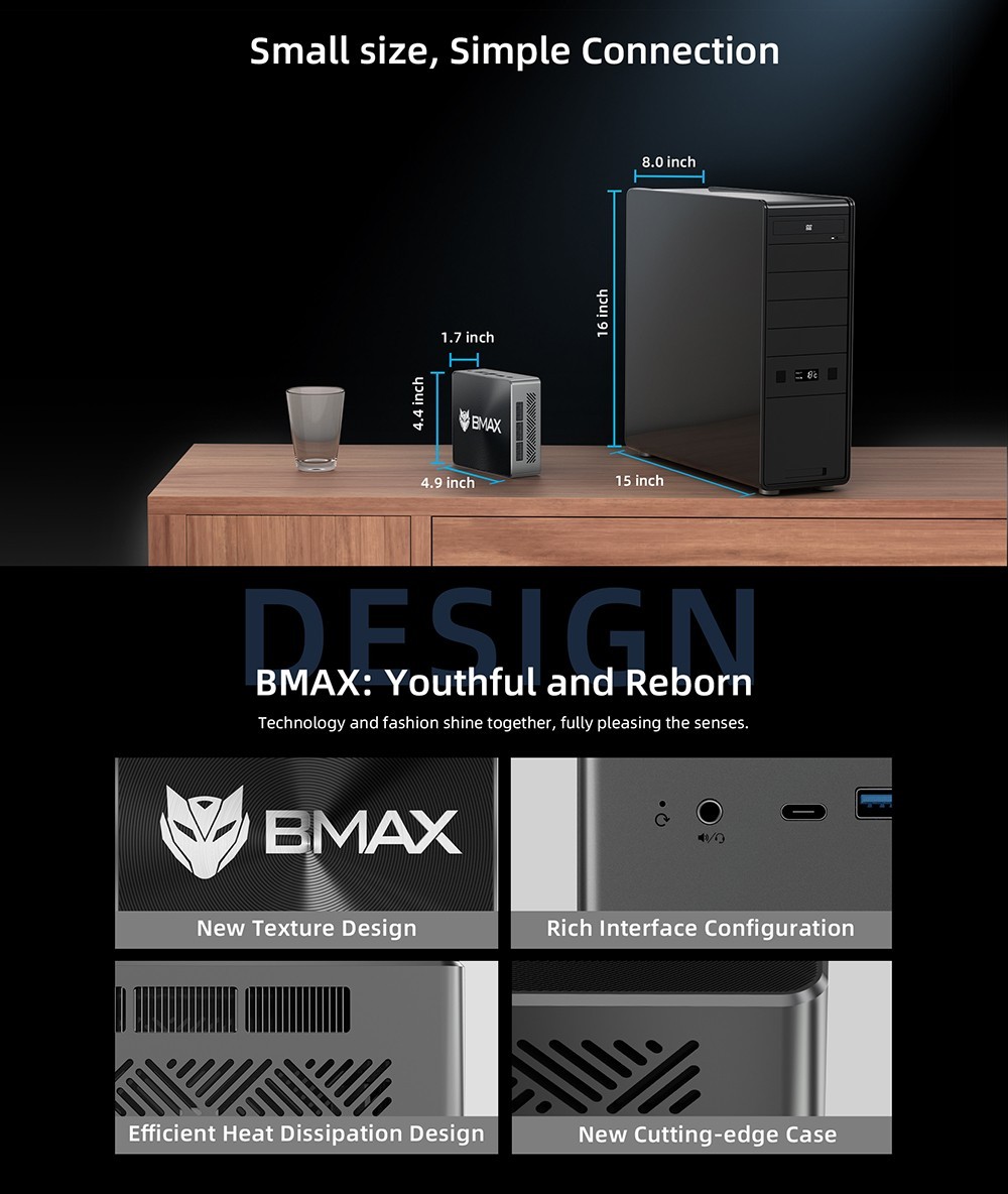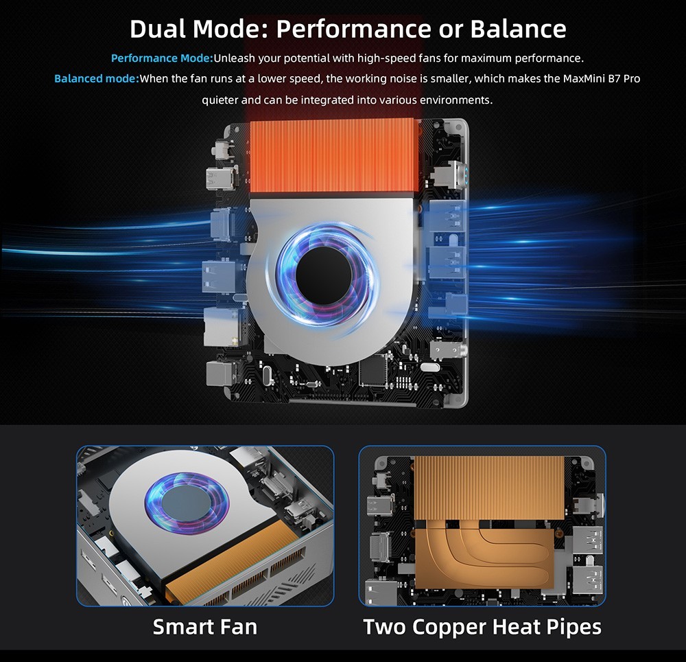 The mini PC has a cooling system smart fan + two copper heat pipes, which enables BMAX B7 Pro to have better heat dissipation and quiet performance.