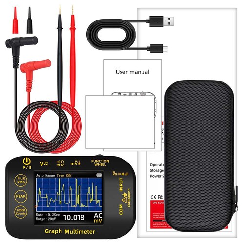 | Specification | Display screen: 2.8" TFT color screen Resolution: 320×240 pixels Battery type: 1800mAh Lithium battery Working environment: Temperature: 0~40℃ Humidness: <75% Storage environment: Temperature: -20~60℃ Humidness: <80% DC voltage: 0~1000V; 0~200mV Ac voltage: 0-750V; 0~200mV Resistance: 200.00Ω, 2~200kΩ, 2~20MΩ, 200.00MΩ Capacitance: 999.99nf, 9.999uF, 999.99uF, 99.999mF Temperature: -20~1000°C, -4~1832℉ |