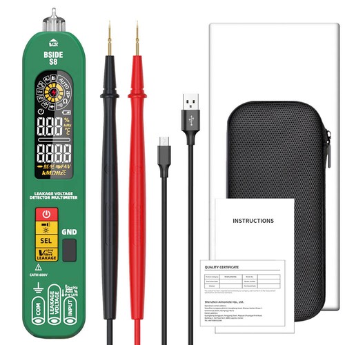 | Specification | Material: ABS Battery: 1 built-in 3.7V, 400mAh battery (included) DC Voltage: 0-620V(DC Mode), 0.8-620V (Auto Mode), 0.001V, ±(0.8%+3) AC voltage: 0-620V(AC Mode), 0.8-620V (Auto Mode), 0.001V, ±(1.2%+5) VFC mode: 10-620V, 1V, ±(4.0%+3) Leakage test mode: 12-300V, 1V, ±5% Resistance: 0.0Ω-60MΩ, ±(1.5%+3), 0.1Ω, ±(1.2%+3) Capacitance: 1nF-60mF, 0.01nF, ±(3.5%+8) Frequency: 1Hz-9.999MHz; 0.001Hz, ±(1.2%+3) Temperature: -50°C to 999°C, 1°C/℉, ±(1.5%+2) Environment temperature: 0-50°C, 1°C, ±2°C Diode: Automatic recognition of diodes less than 3V On-off continuity test: Buzzer sounds when the measured resistance is <500Ω NCV: yes Inductive zero-fire wire recognition: yes Auto shut-off: 15 minutes Flashlight: yes |