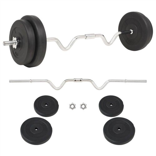 This versatile barbell set is perfect for targeting chest, biceps, arms, triceps and back muscles. It includes two 7.5 kg plates, two 5 kg plates, and one 5.4 kg barbell bar and has a total weight of about 30 kg. This set allows the users to variably select the weights they want to lift for different exercises. These plates are made of cement in the plastic shell and they can easily be secured onto the bars with the included star locks. The weight is clearly stamped on each plate for quick and easy identification.