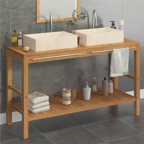 This stylish wooden bathroom cabinet with two sinks with a beautiful yet simplistic style is a perfect match for your bathroom or washroom decor. The sink cabinet is constructed from solid teak wood which is durable and sturdy enough to place a basin on the top, including other bathroom accessories. The vanity cabinet has a handrail for hanging towels or clothes. It also has four supporting legs to ensure stability and dryness above the ground. The striking basin is user-friendly for everyday use and is a wonderful adornment for your living space. Fully handmade of graceful marble, the basin is extremely sturdy with an elegant look. Additionally, the washbasin is very easy to clean. The cabinet fits perfectly under your sink and makes bathroom storage quite convenient. Note: Marble is a natural product and colour differences might therefore occur. The real product might be lighter or darker than in the photos and sometimes there might be a mix of colours in the product.