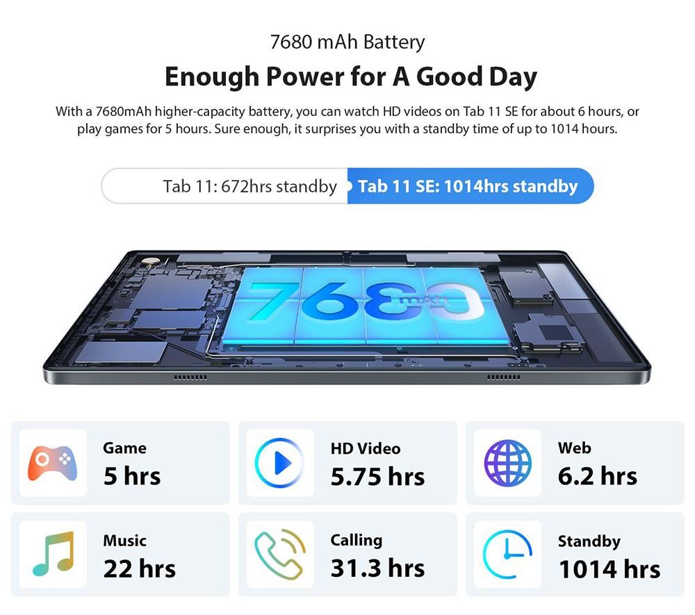 With a 7680mAh higher-capacity battery, you can watch HD videos on Tab 11 SE for about 6 hours, or play games for 5 hours. Sure enough, it surprises you with a standby time of up to 1014 hours.