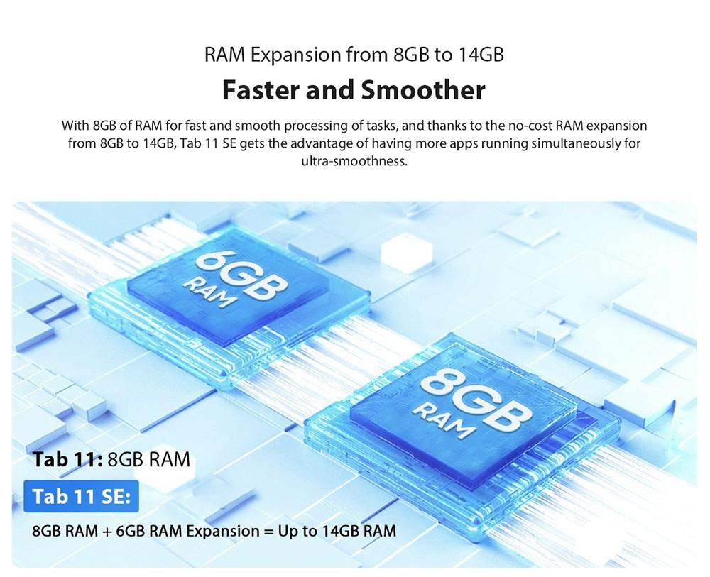 With 8GB of RAM for fast and smooth processing of tasks and thanks to the no-cost RAM expansion from 8GB to 14GB, Tab 11 SE gets the advantage of having more apps running simultaneously for ultra-smoothness.