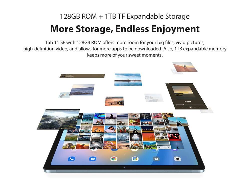 Tab 11 SE with 128GB/256GB ROM offers more room for your big files, vivid pictures, and high-definition video, and allows for more apps to be downloaded. Also, 1TB expandable memory keeps more of your sweet moments.