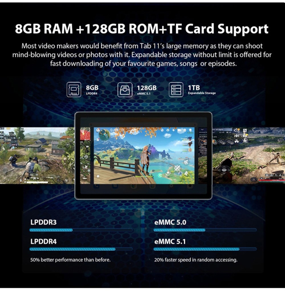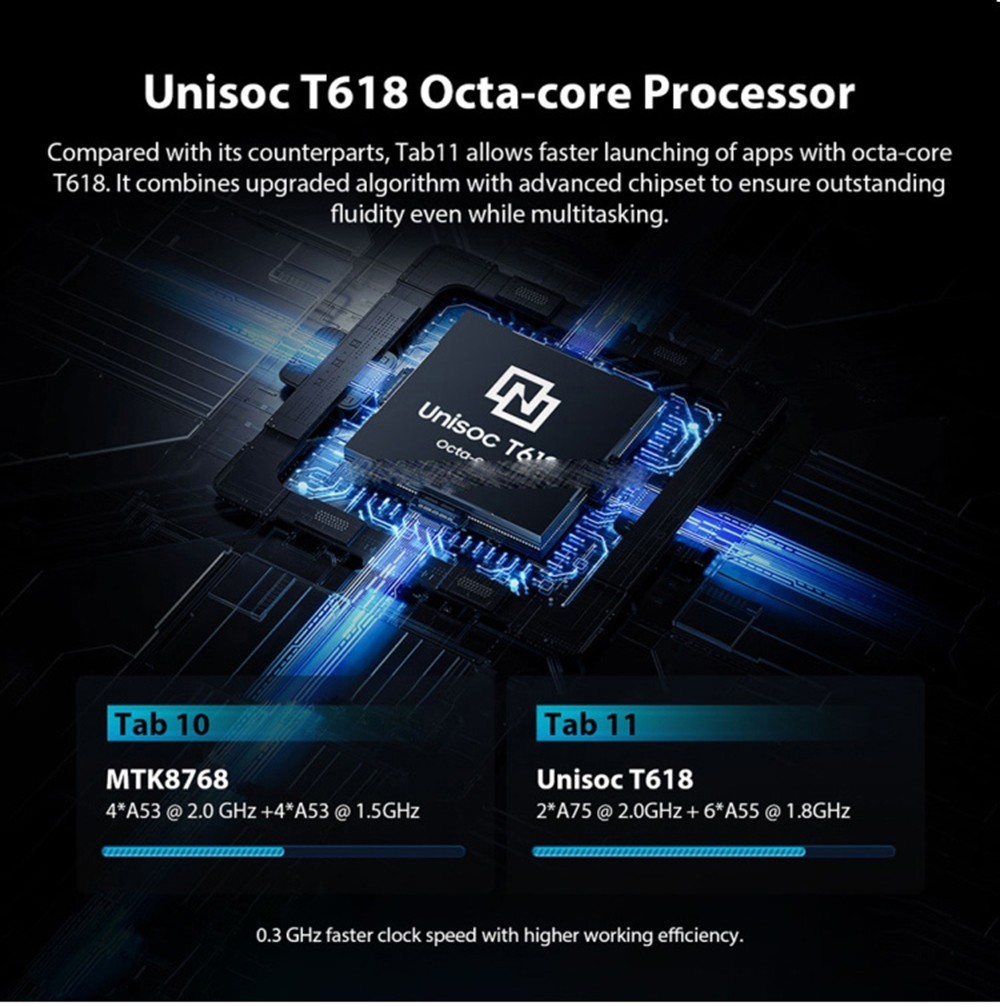 Compared with its counterparts, Tab11 allows faster launching of apps with octa-core T618, which combines upgraded algorithm with advanced chipset to ensure outstanding fluidity even while multitasking.