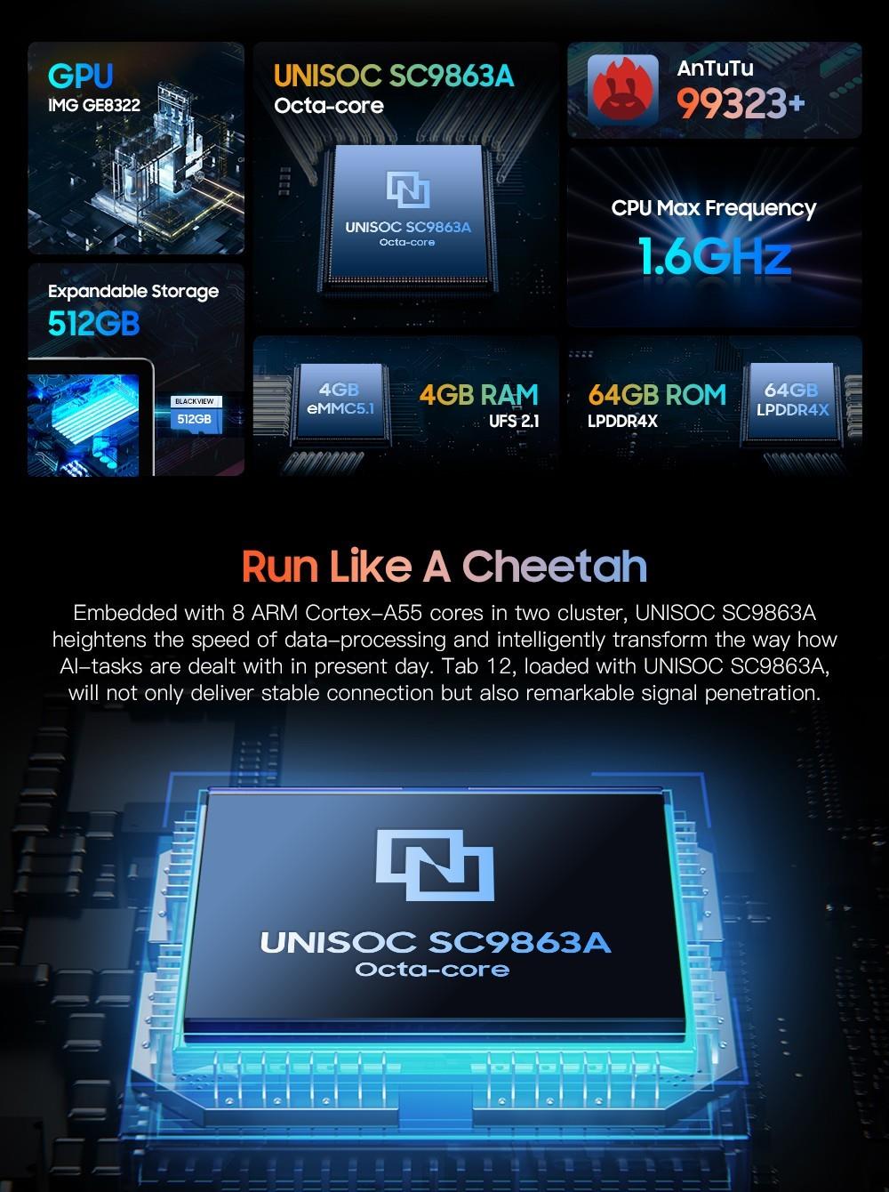 | General | Brand: Blackview Model: Tab 12 OS: Android 11 CPU: Spreadtrum SC9863A Graphics Chip: IMG GE8322 |