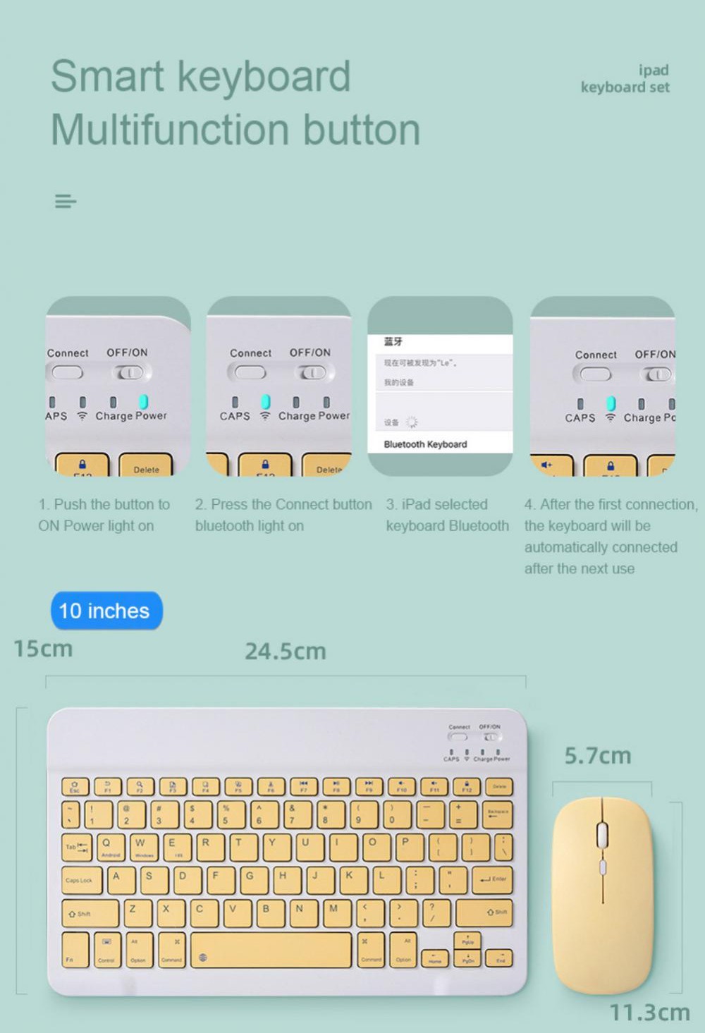 | Specification | Keyboard Connection method: Bluetooth Connection distance: 8m-10m Compatible system: IOS/Android/Microsoft Suitable for: smartphone/tablet/laptop (need to have Bluetooth function) Smart sleep: no use, sleep after 30 minutes Continuous use time: 100 hours Standby time: 100 days Charging time: 3-4 hours Mouse Connection method: Bluetooth/2.4GHz Wireless USB Connection distance: 8m-10m Mouse DPI: 800/1200/1600 Compatible system: IOS/Android/Microsoft Suitable for: smartphone/tablet/laptop/computer Smart sleep: no use, sleep after 3 minutes Continuous use time: 100 hours Standby time: 100 days Charging time: 2-3 hours |