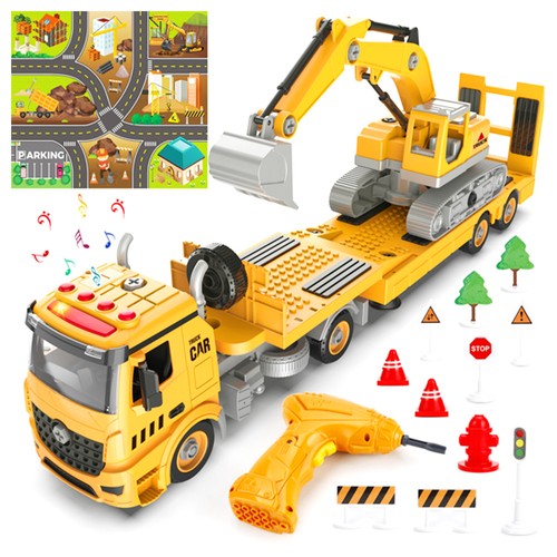 This construction trailer truck and excavator toys set includes 108pcs building blocks for your toddlers to build their own big construction vehicles with the electric drill. What a joy it will be when your kids play with the toy set on the included playmat (road signs and roadblocks also included)