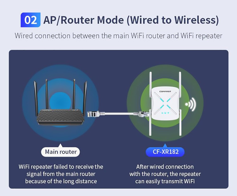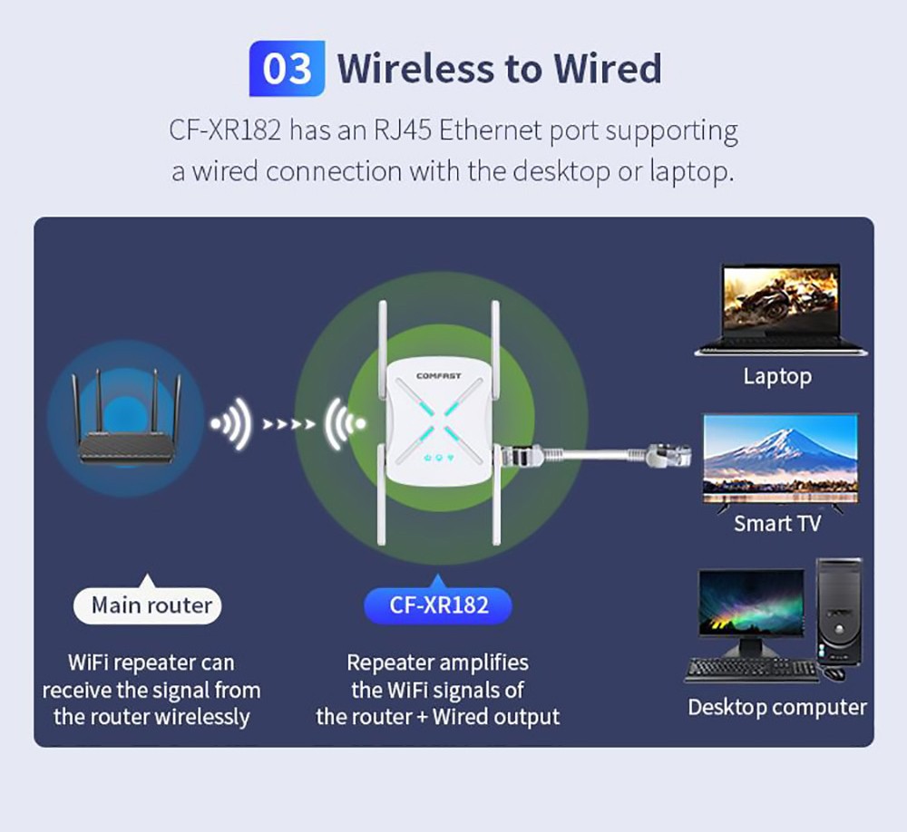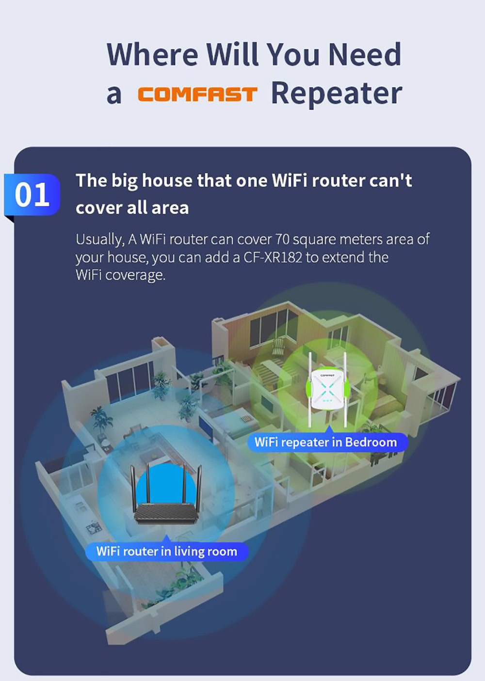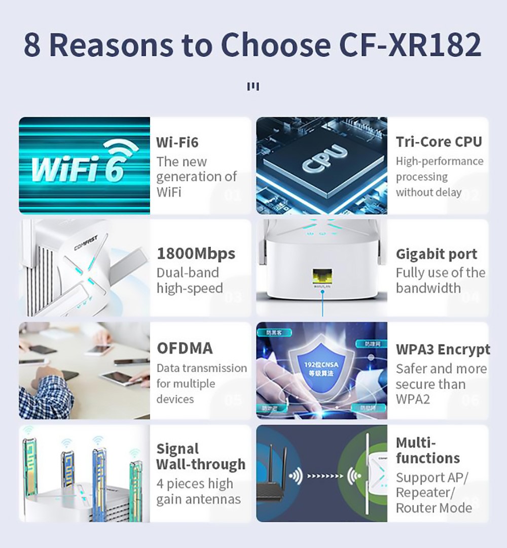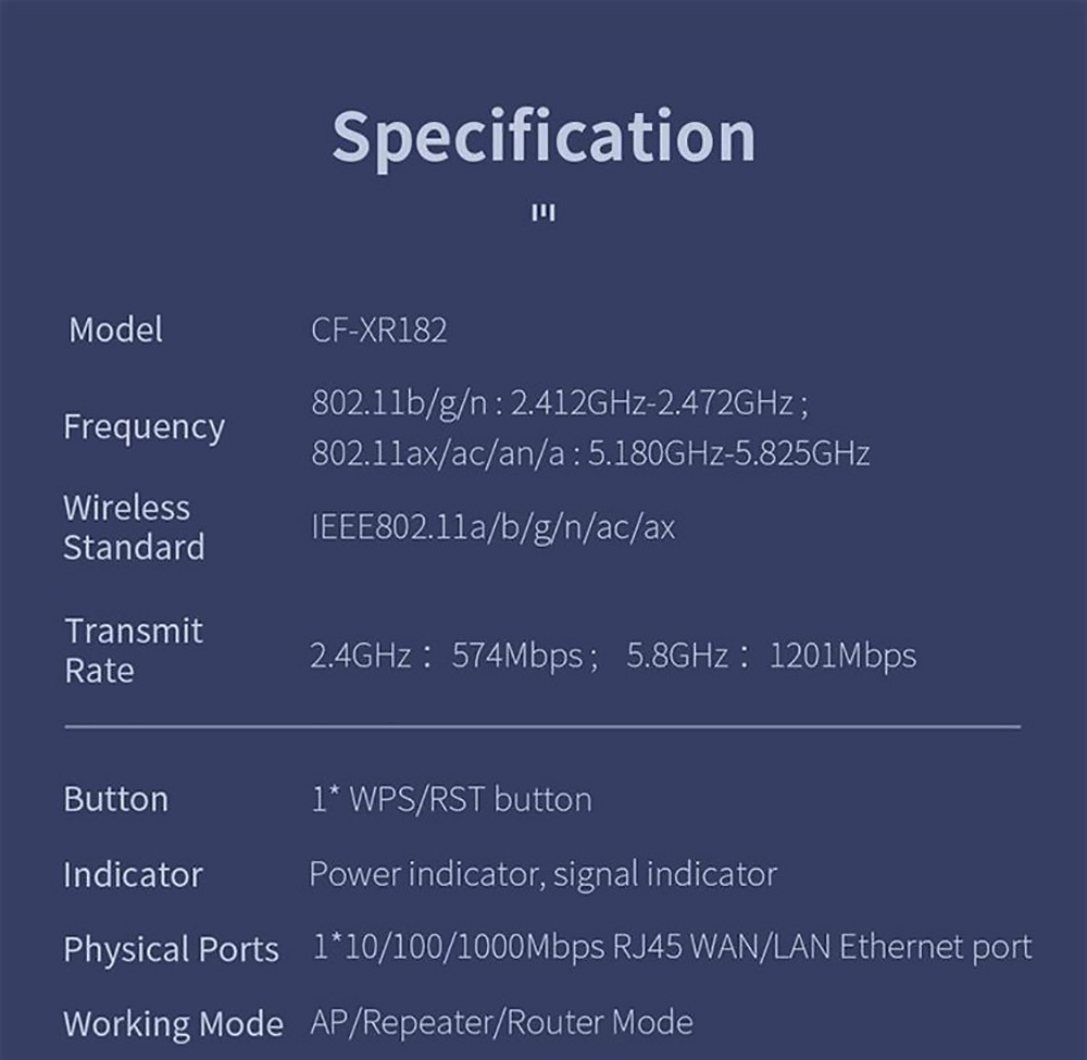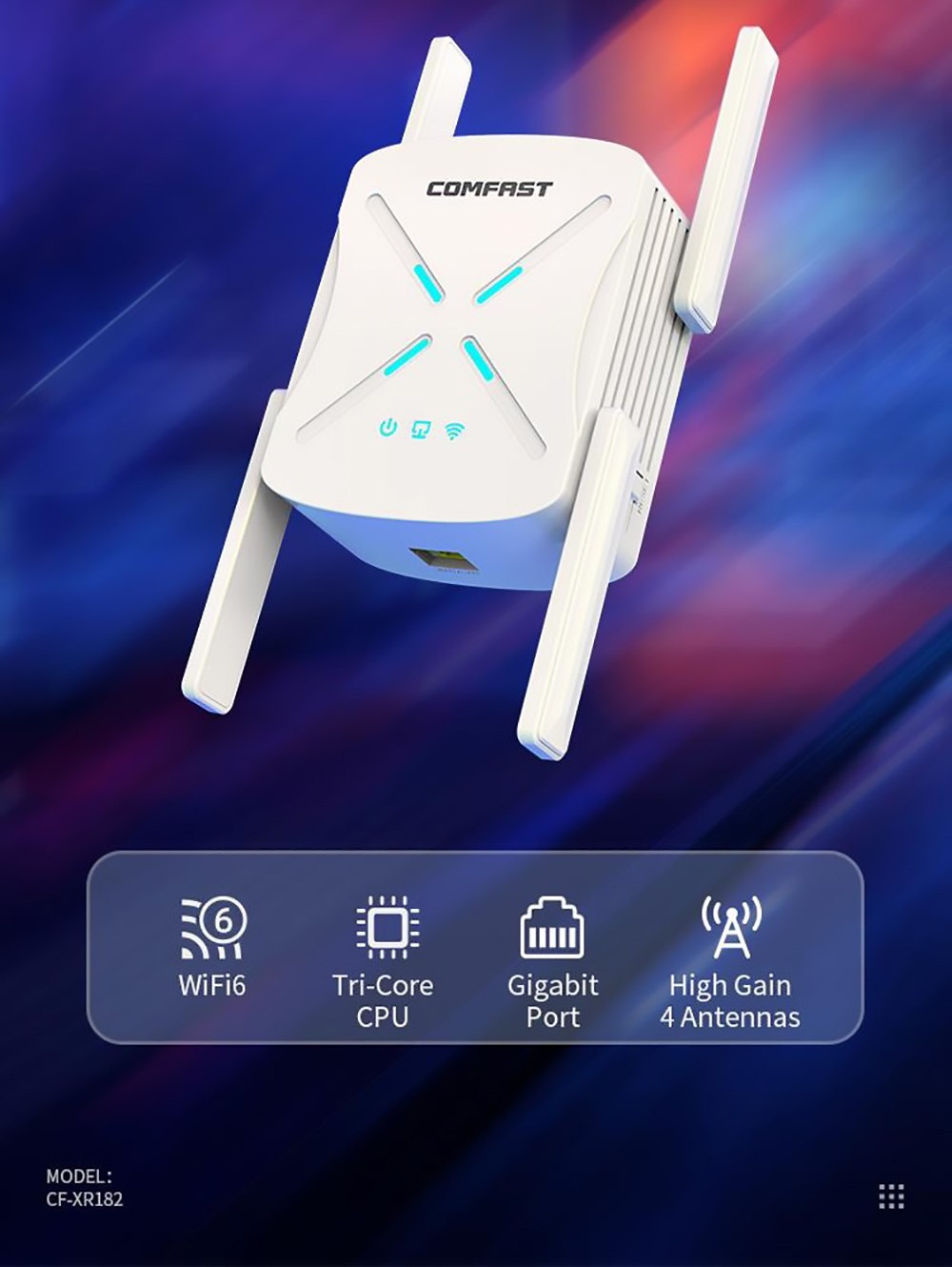 | General | Brand: COMFAST Type: Repeater Model: CF-XR182 Color: White |