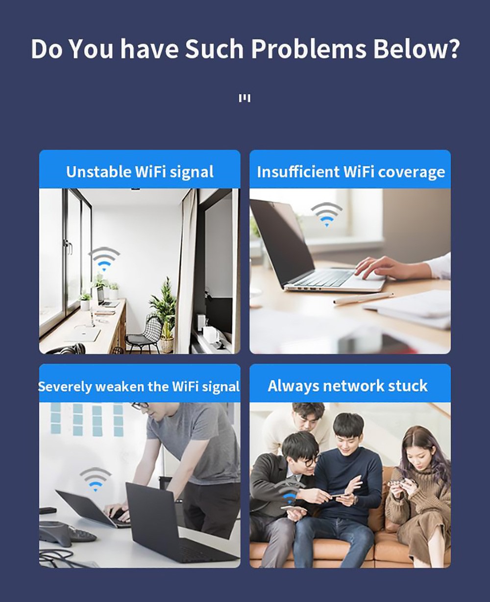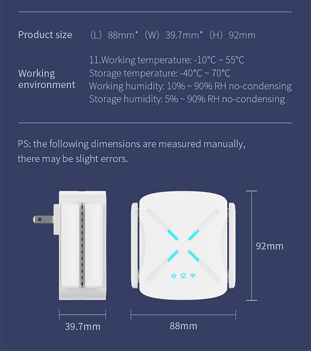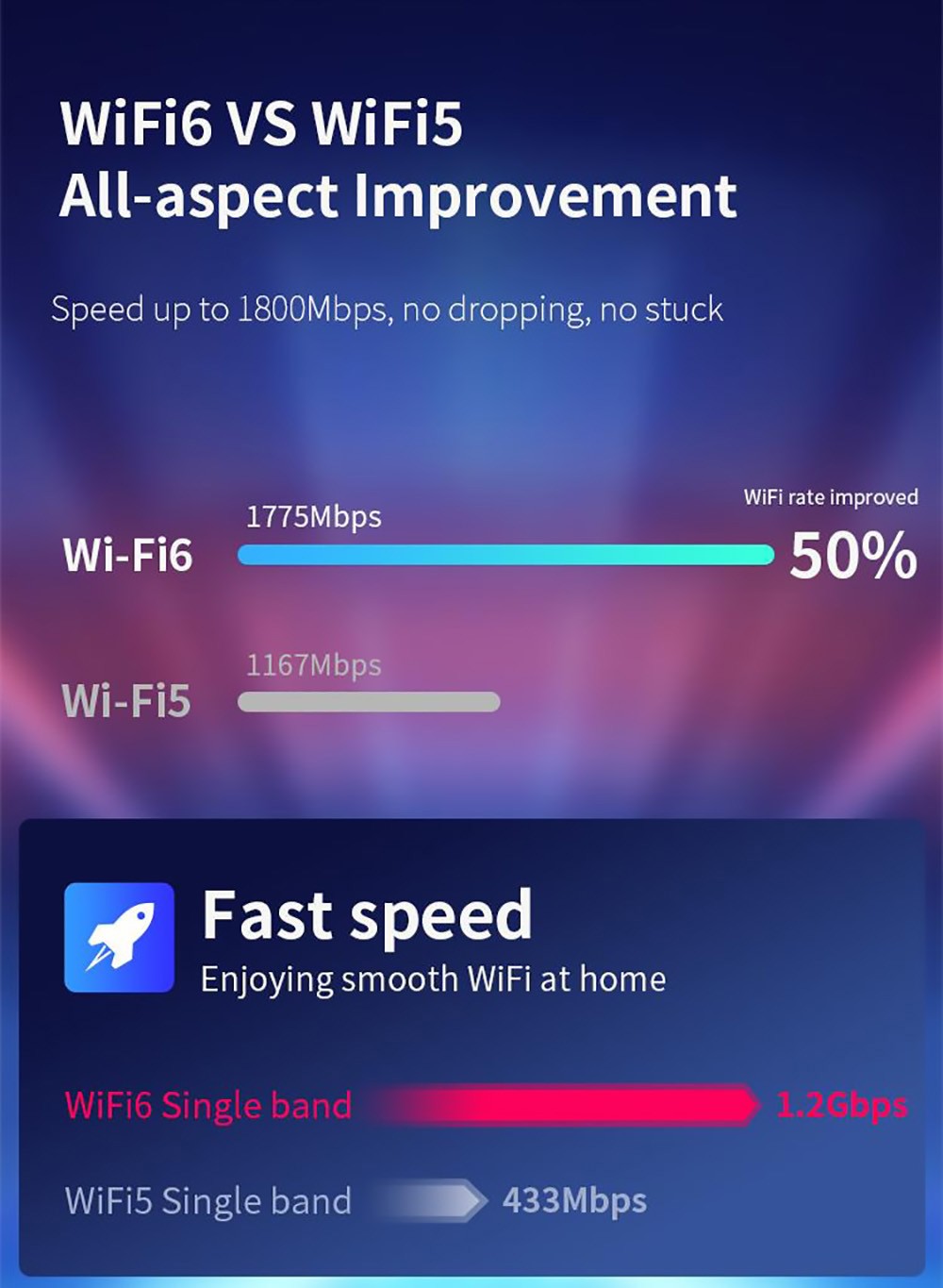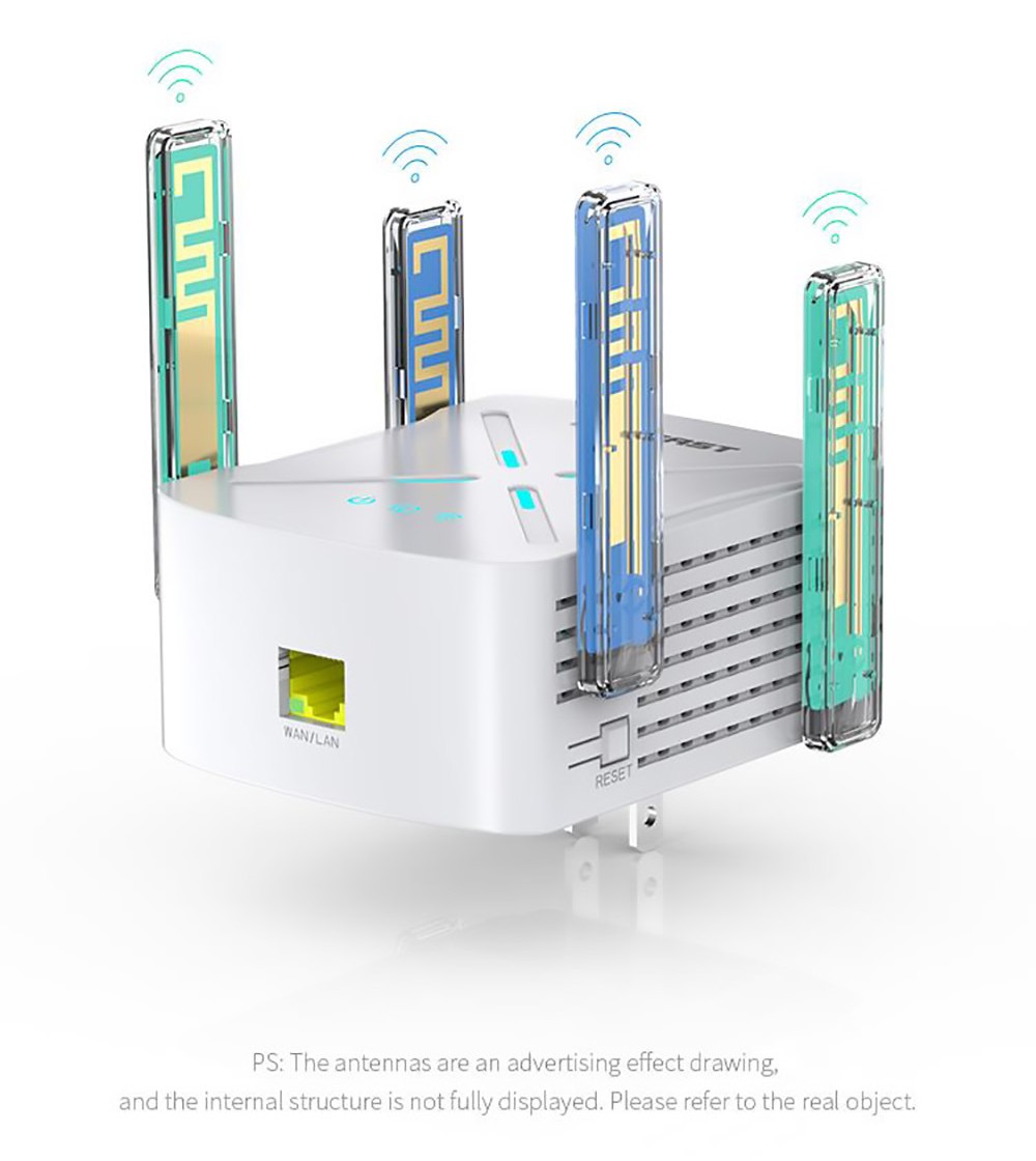| Specification | Chipset: MT7621A+MT7905D+MT7975D, DDR: 128M, Flash:16M Antenna: 4*5dbi Antennas Wireless Standard: IEEE802.11a/b/g/n/ac/ax Transmission Rate :2.4GHz :574Mbps ; 5.8GHz :1201Mbps Output Power (Max): 200mW(≈23dBm) Receiver Sensitivity (Max): -96dBm Frequency: 2.412GHz-2.472GHz; 5.180GHz_5.825GHz Working Mode: AP / Repeater / Router Mode Power: 100~240V,50/60Hz |