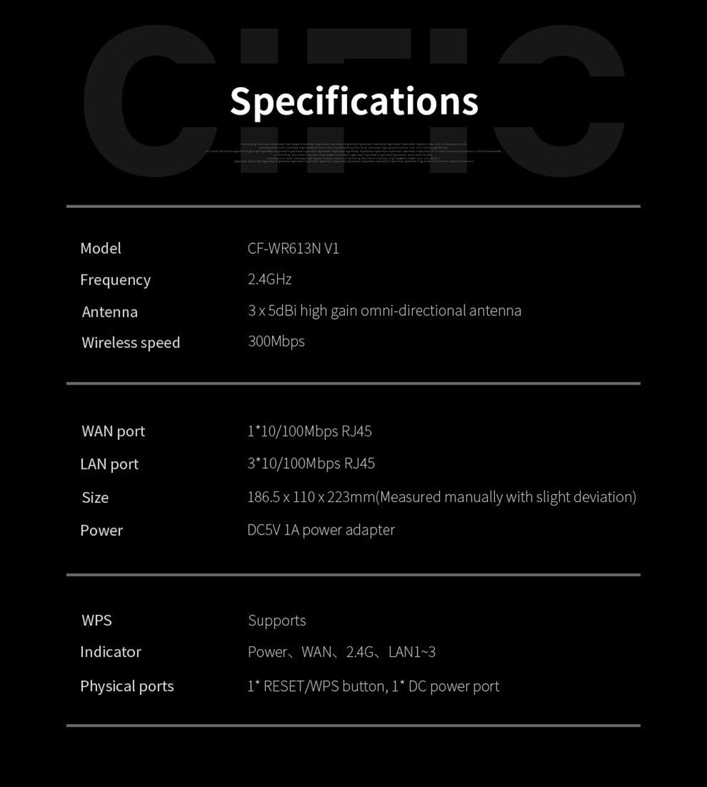 | General | Brand: COMFAST Type: Router Model: WR613N V1 Color: White |