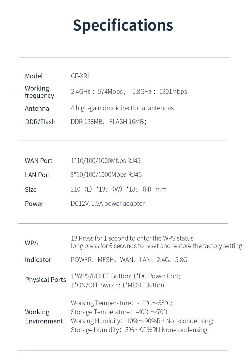 Working Frequency: 2.4GHz: 574Mbps; 5.8GHz: 1201Mbps
