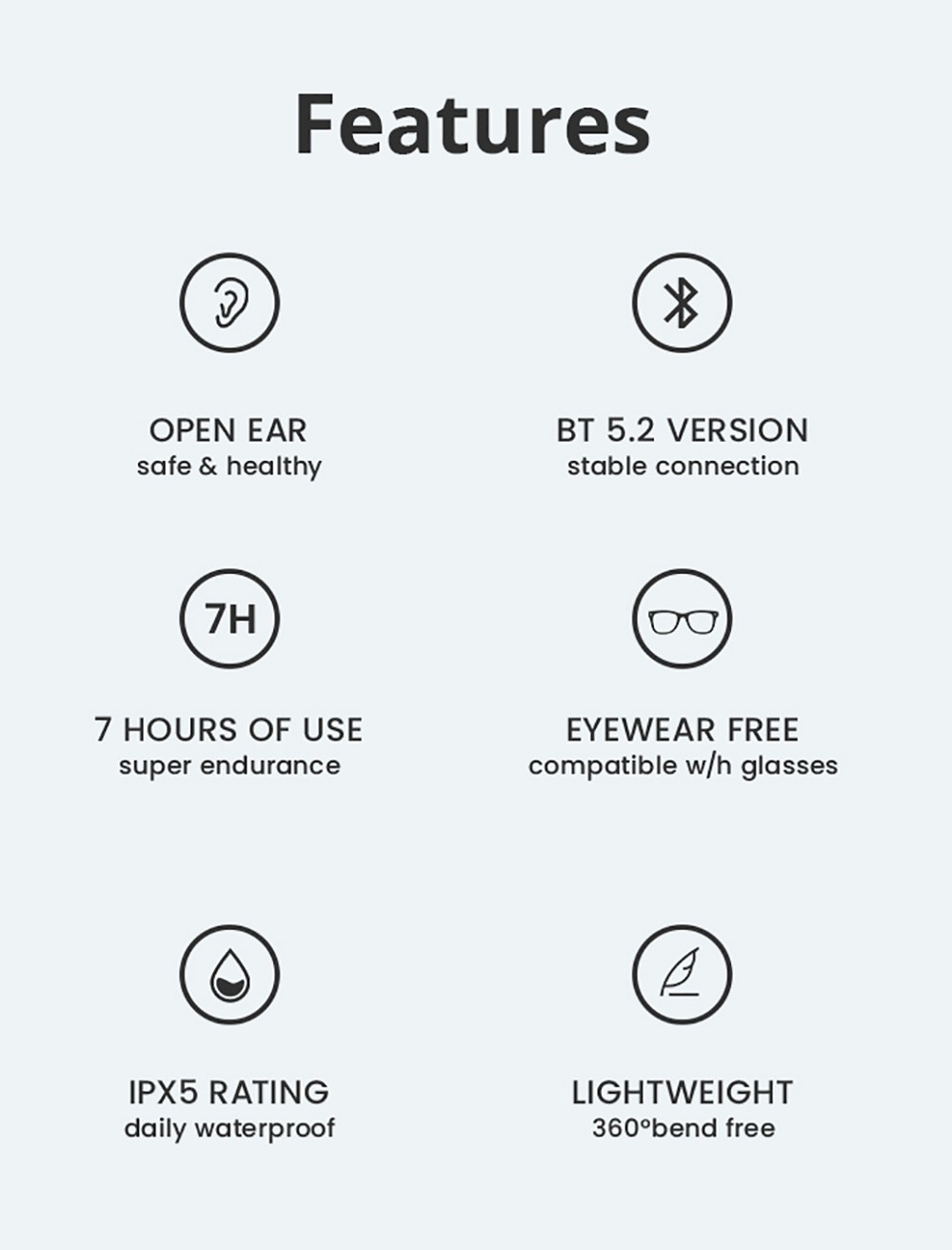 | Specification | Bluetooth: BT V5.1 Connection Distance: about 10 meters Battery Capacity: 180mAh Playing Time: about 7 hours Talk Time: about 6 hours Charging Time: about 2 hours Material: ABS+PC+Titanium Alloy Belt Wearing Method: Hanging Ear |