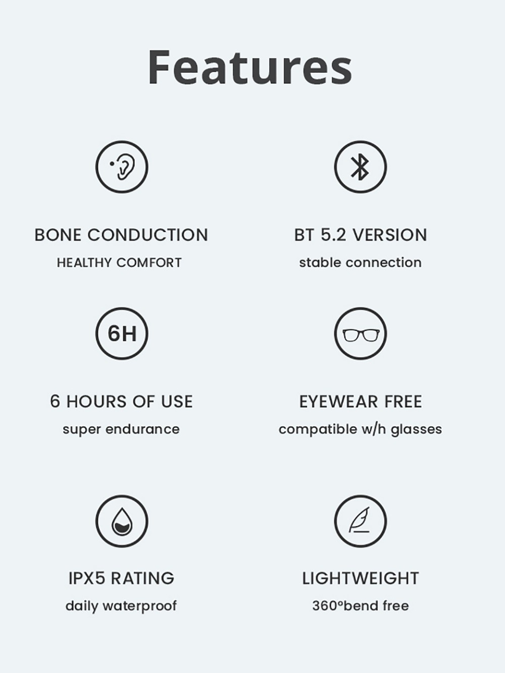 | Specification | Bluetooth: BT V5.2 Connection Distance: about 10 meters Battery Capacity: 180mAh Playing Time: about 7 hours Talk Time: about 6 hours Charging Time: about 2 hours Material: ABS+PC+Titanium Alloy Belt Wearing Method: Hanging Ear |