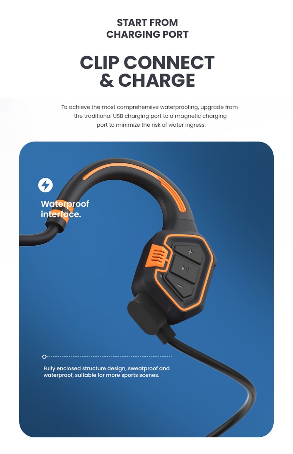 | Specification | Play Mode: BT 5.1 + 16GB MP3 Connection Distance: about 10m Rating: IP68 Waterproof Battery: 3.7V 160mAh Charging Time: 1.5 hours Play Time: 5 hours Storage: 16GB Memory Song Format: MP3, WAV |