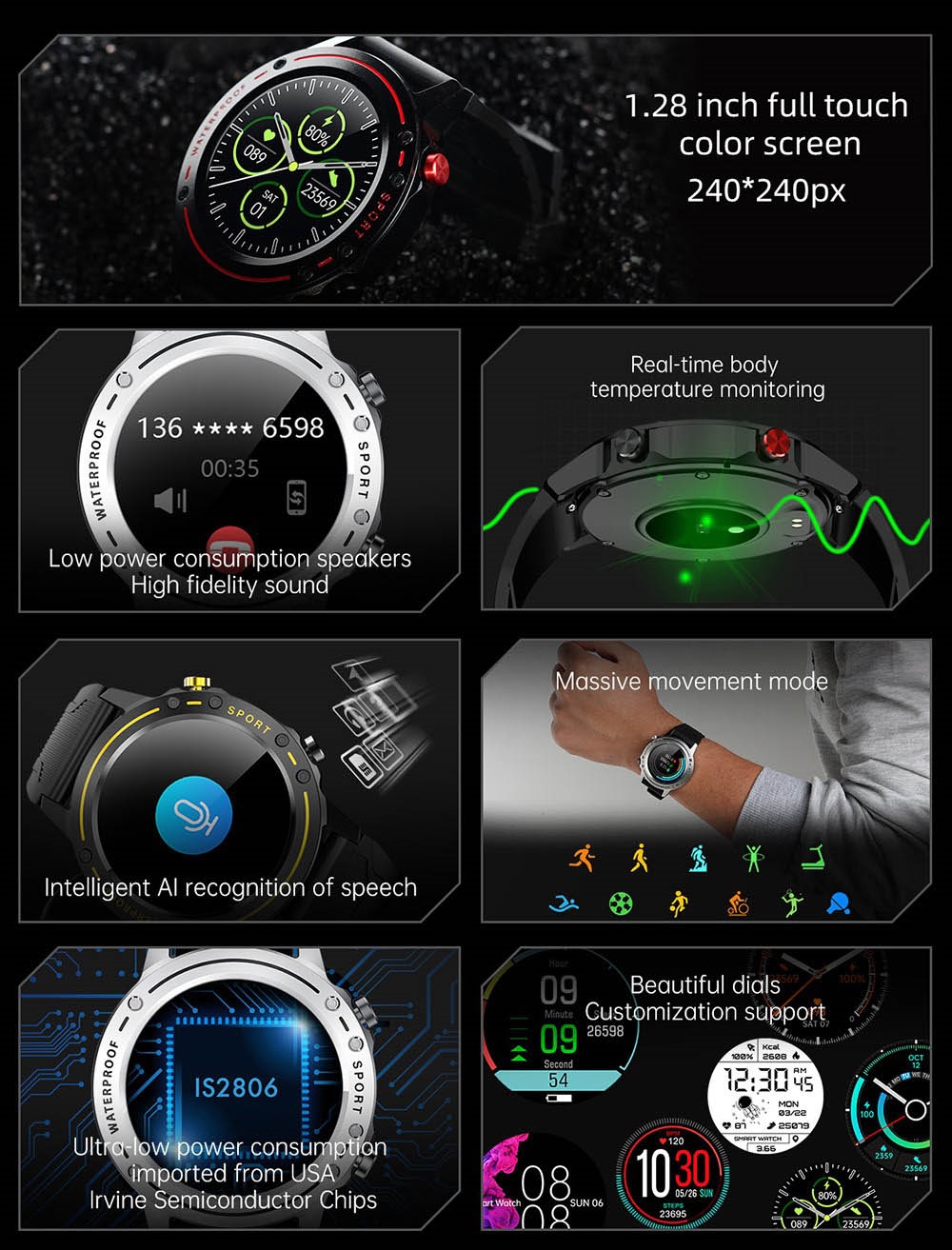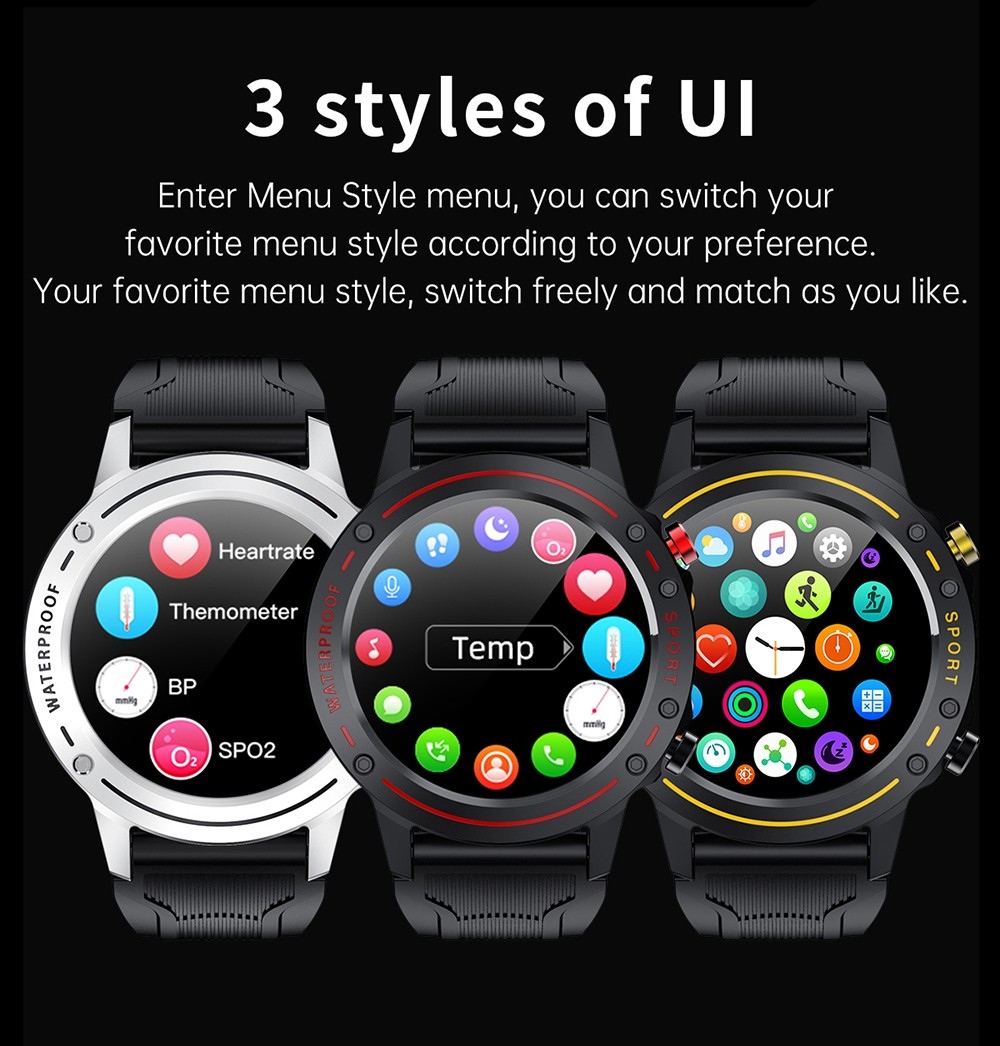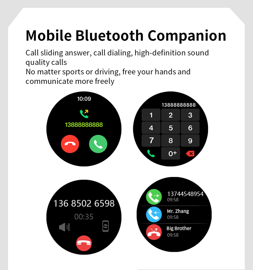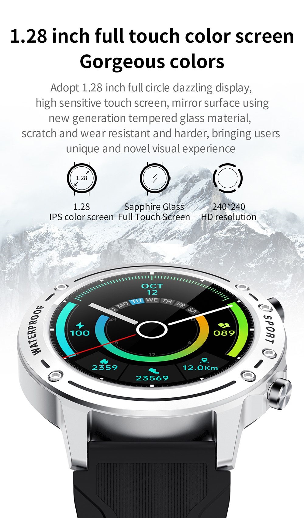 1. 1.28-inch full-touch color screen: It adopts a 1.28-inch full-circle colorful display, a highly sensitive touch screen, and the mirror is made of tempered glass material, which is scratch-resistant and wear-resistant.