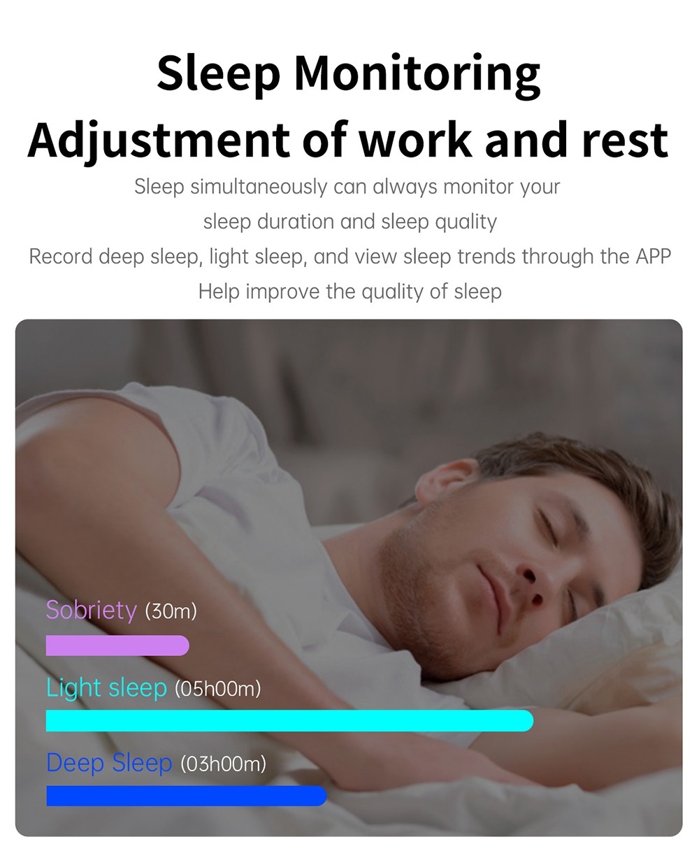 4. Sleep monitoring: You can monitor your sleep duration and sleep quality at any time, record deep sleep and light sleep through the APP, view sleep trends, and help improve sleep quality.