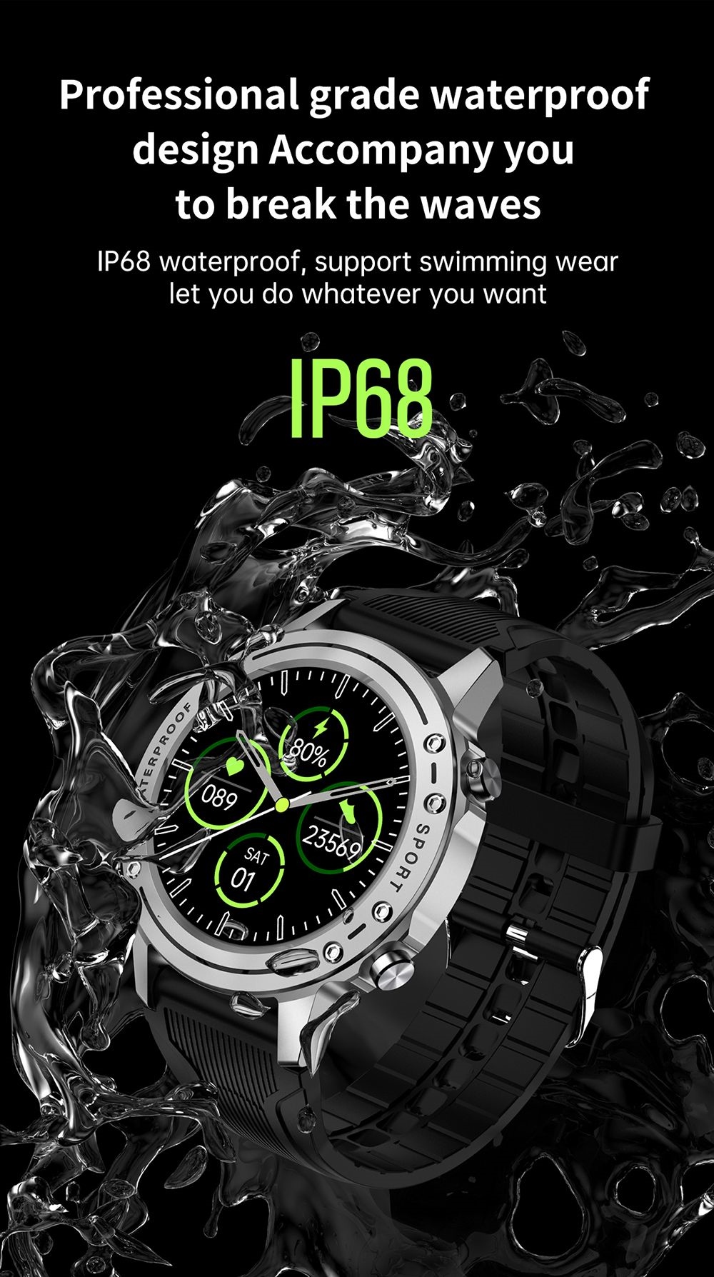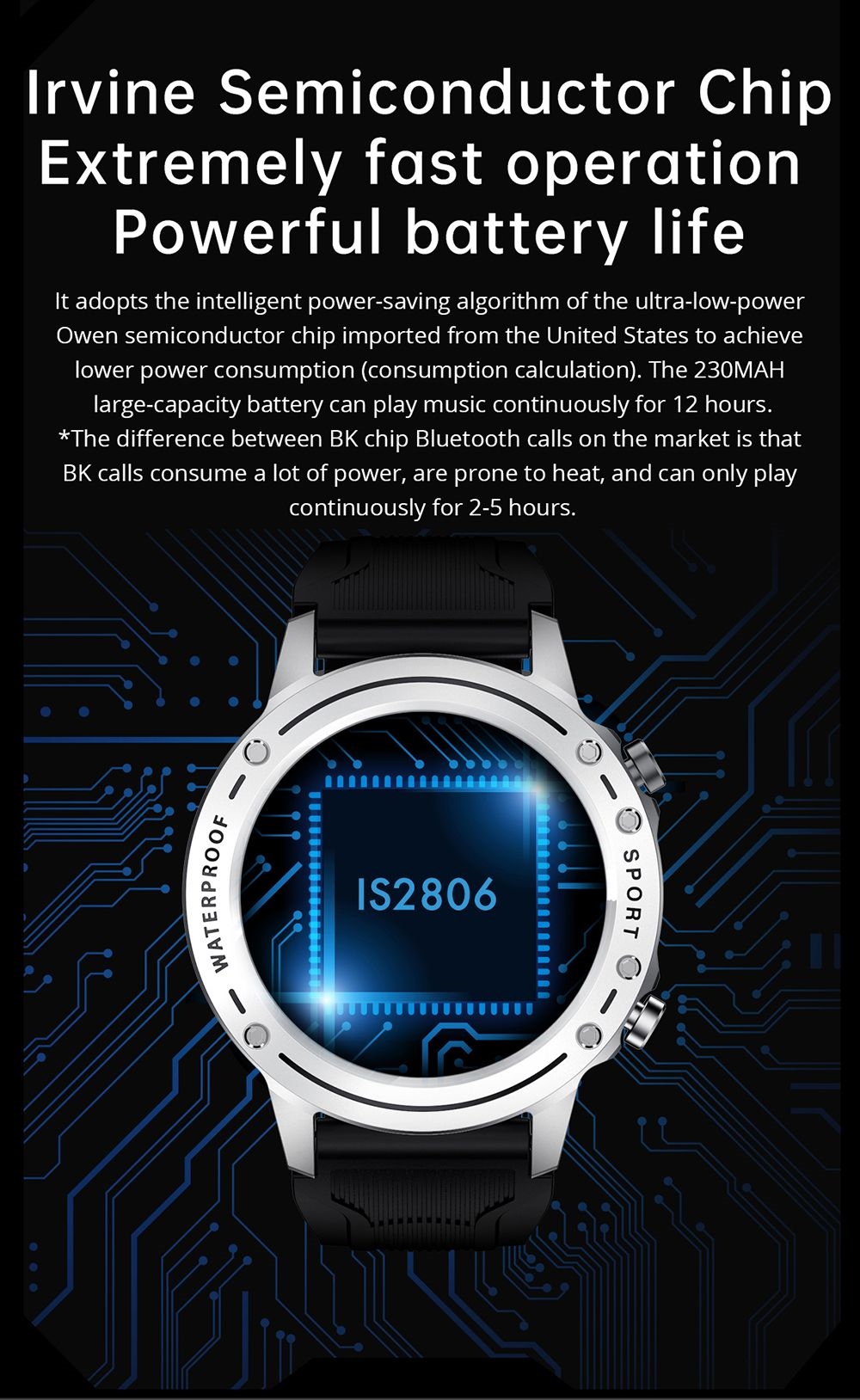 | Hardware | Chipset: is2806 APP: V Band Compatible System: Android4.4 or above, IOS8.4 or above Flash memory: 64MB Waterproof: IP68 Bluetooth: 5.0 |