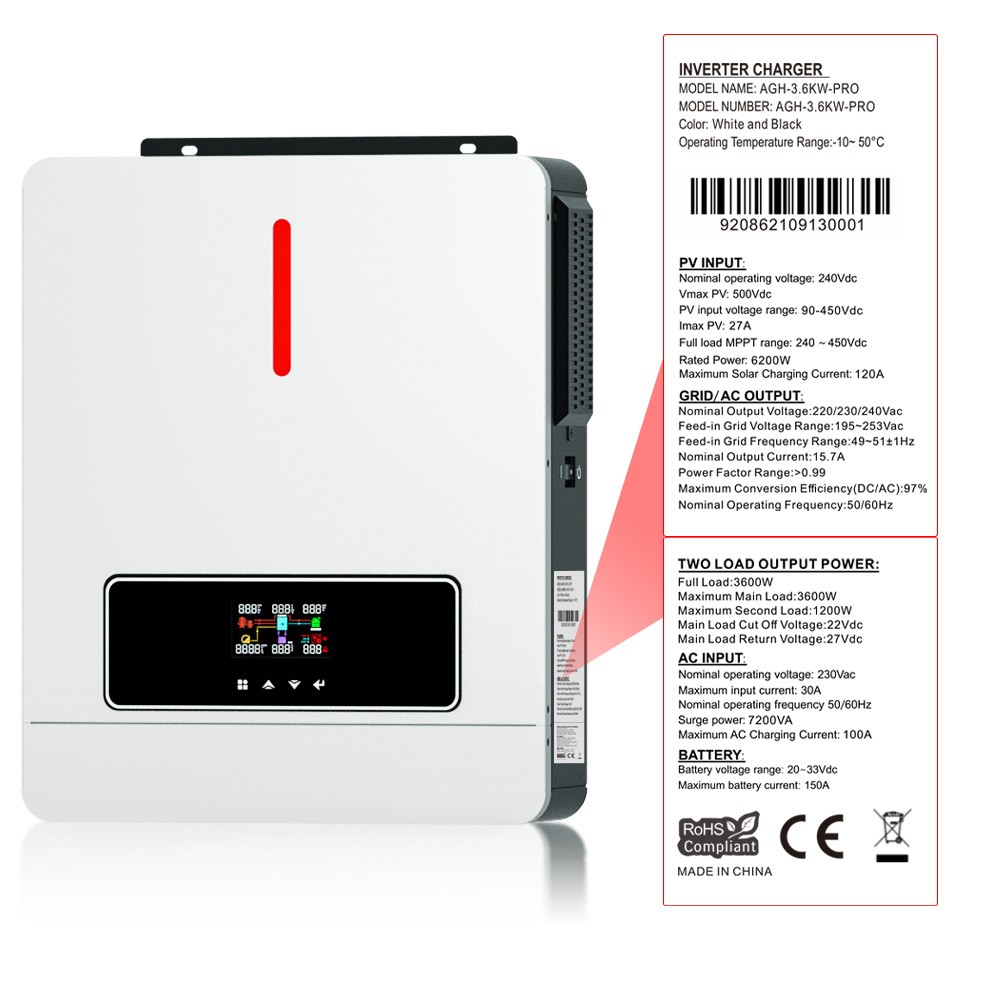 | General | Brand: DAXTROMN Type: Hybrid Solar Inverter Model: AGH-3.6KW-PRO Color: White |