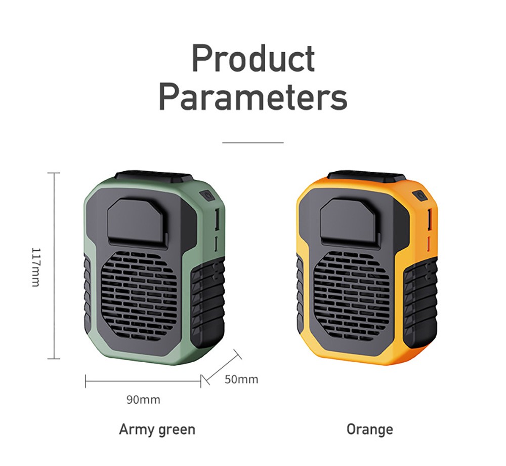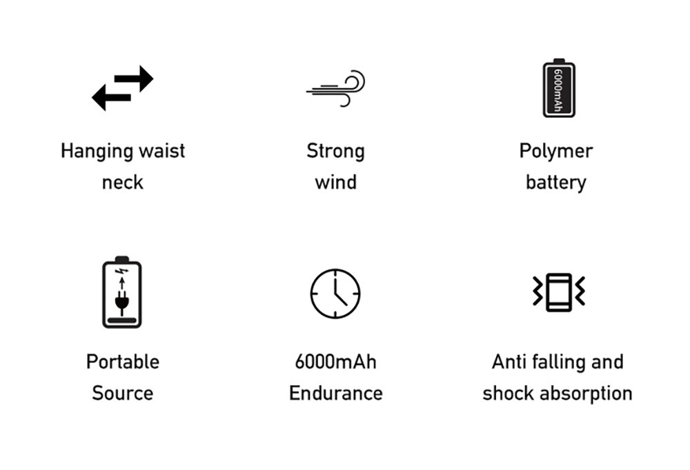 | Specification | Rated Input: DC 5.0V/1.0A Rated Power: ≤5W Output: 5V/2A Battery Capacity: 6000mAh Wind Speed: 3-gear Battery Runtime: 7-23 hours Product Material: ABS/silicone/electronic components |